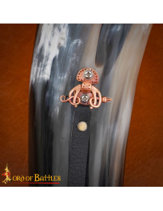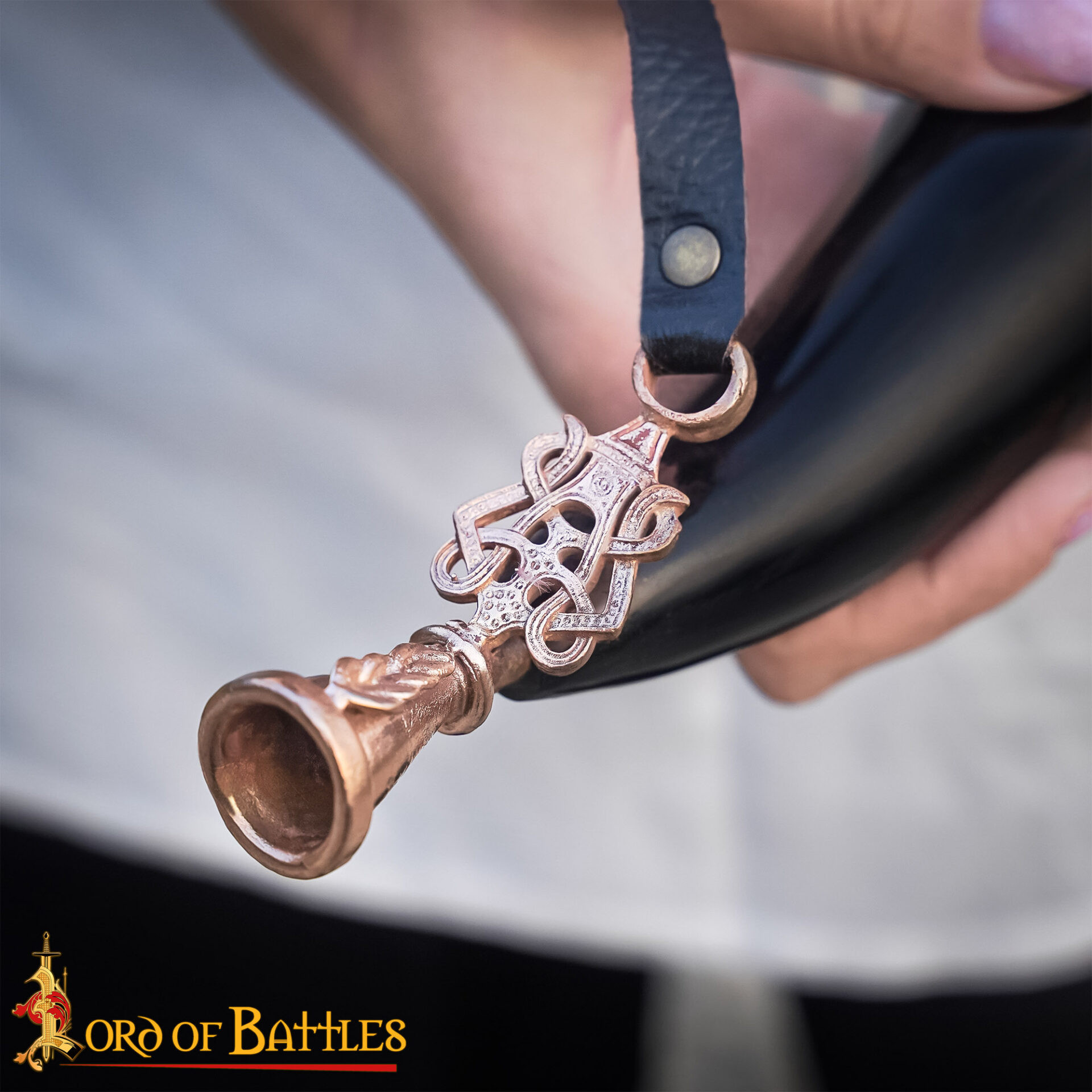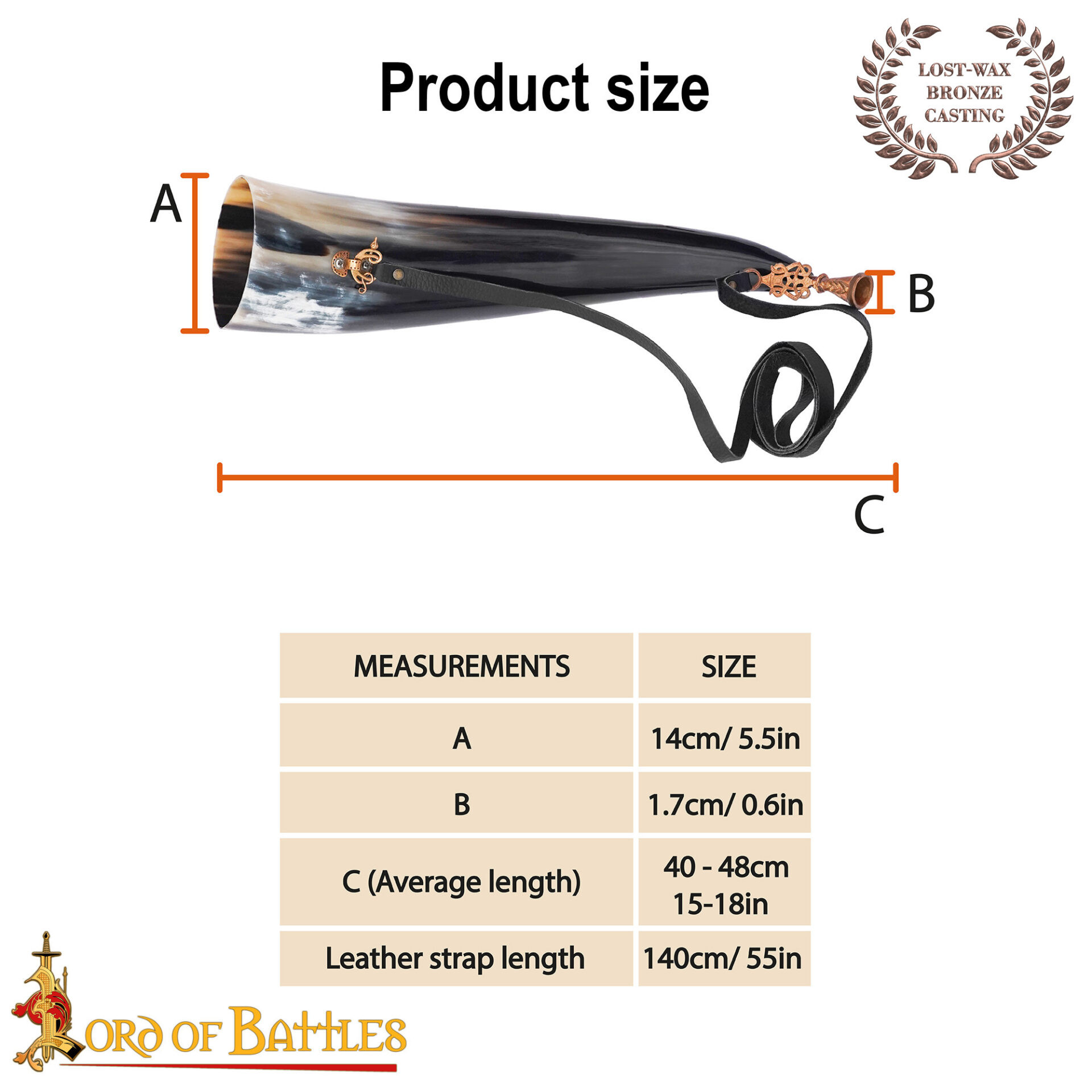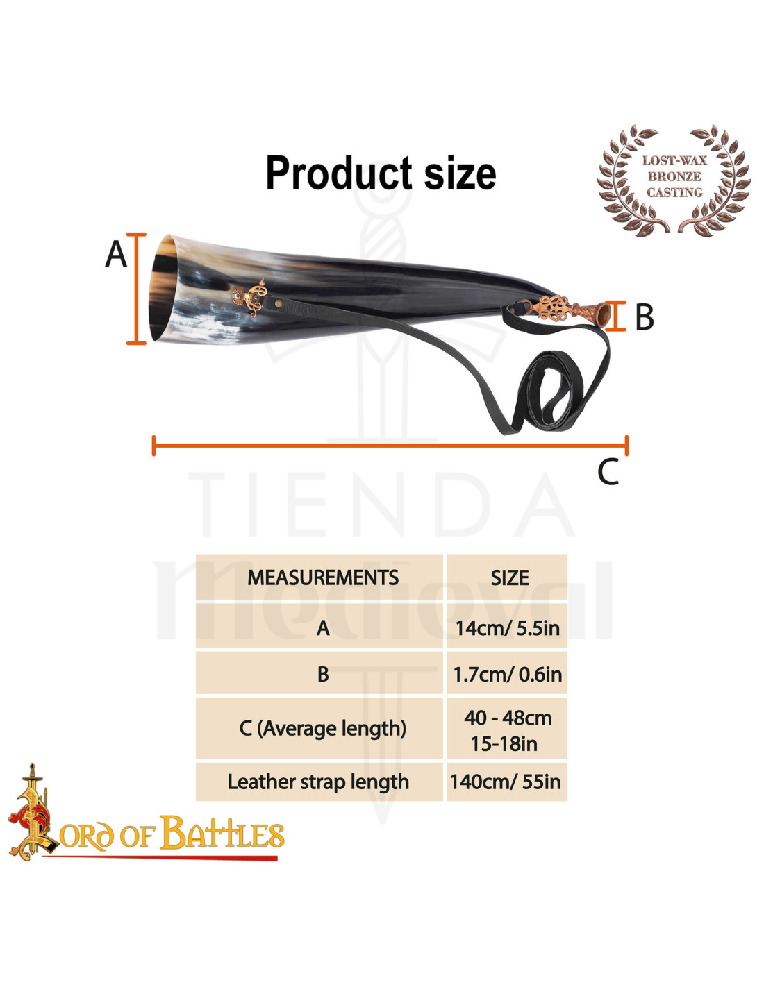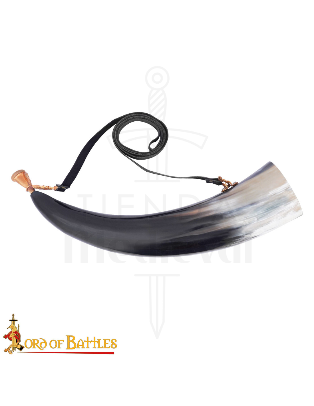 Realizzato a mano con corno naturale di bue, la sua lucidatura mette in risalto una gradazione unica di tonalità che va dal nero profondo al crema caldo, assicurando che ogni pezzo sia irripetibile e accattivante. Il bocchino in ottone, creato con l'antica tecnica della cera persa, cattura un lavoro di nodi nordici con un livello di dettaglio che aggiunge presenza ed eleganza, mentre la finitura con patina gli conferisce quella lucentezza invecchiata che risalta nelle esposizioni e negli atti cerimoniali.