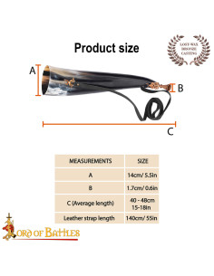 Il design curvato favorisce la presa e l'ergonomia nel suonarlo o nel trasportarlo, e la tracolla nera regolabile con gancio metallico rende il corno un accessorio comodo da portare, pronto per marce tematiche, rappresentazioni o riunioni storiche. La superficie levigata facilita la pulizia e mantiene il carattere naturale del materiale senza perdere l'autenticità.