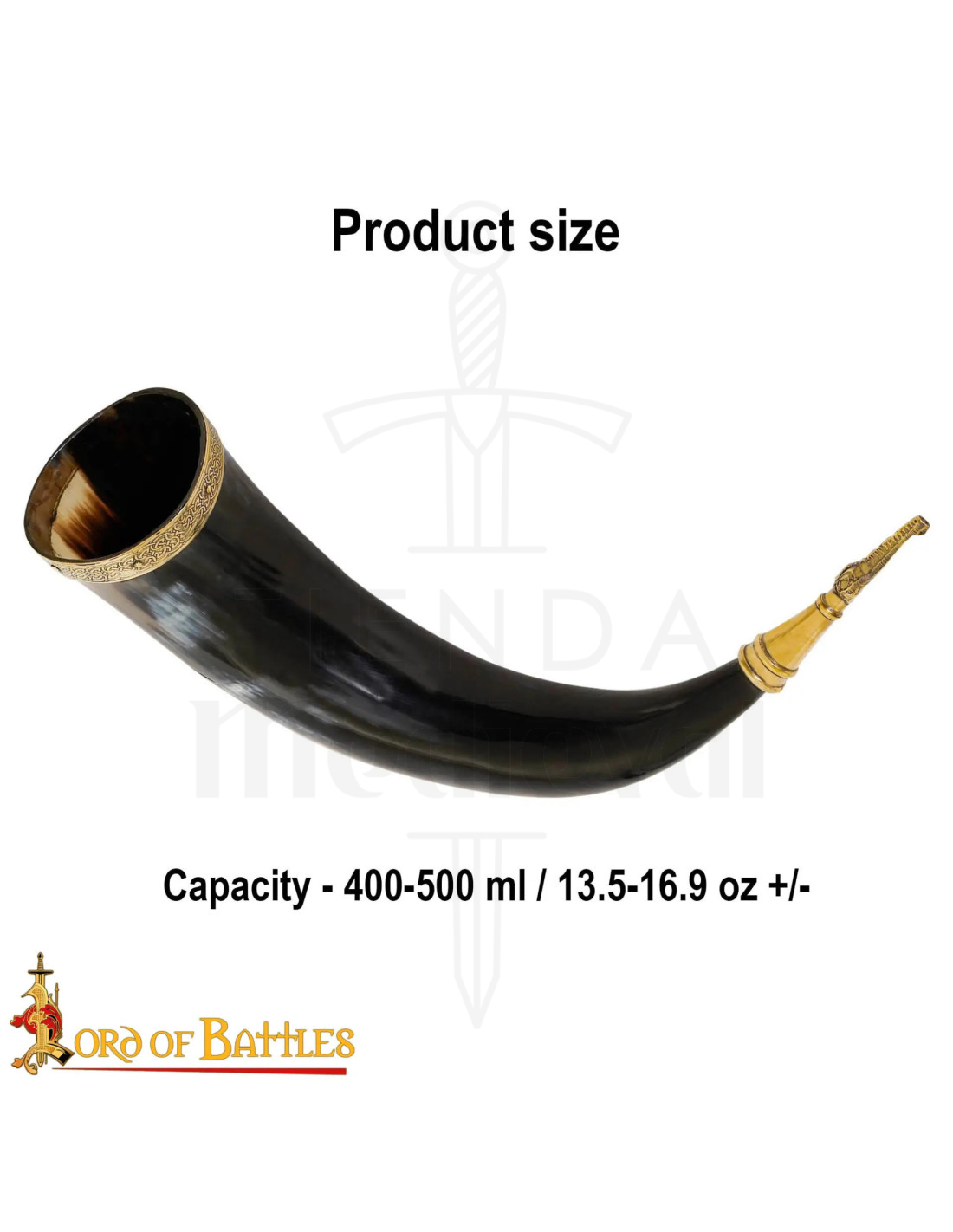 La funzionalità si fonde con il lusso grazie ai suoi particolari in ottone. Il bordo in ottone solido non solo rinforza la bocca del corno, garantendo una durata eccezionale, ma aggiunge anche un tocco dorato e ornamentale. La punta in ottone completa il design, rendendo il corno tanto resistente per l'uso frequente quanto maestoso da esporre. Con una generosa capacità di 400 a 500 ml, potrai gustare la tua idromele o birra come un vero Northman.