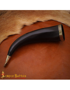 Il bordo e la punta rifiniti in metallo dorato proteggono le zone più esposte e valorizzano la finitura, trasformandolo in un oggetto che sembra appartenere a saghe, senza perdere funzionalità moderna. L'interno trattato con cera sicura per alimenti facilita il suo uso quotidiano, permettendoti di gustare bevande fredde con fiducia e senza comprometterne il sapore.