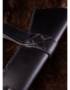 Inoltre, il fodero in pelle nera, progettato per portare la daga in posizione orizzontale, non solo protegge la lama, ma completa anche la sua estetica. Con due cinghie che ne assicurano la tenuta, puoi portarla con te con fiducia e stile.