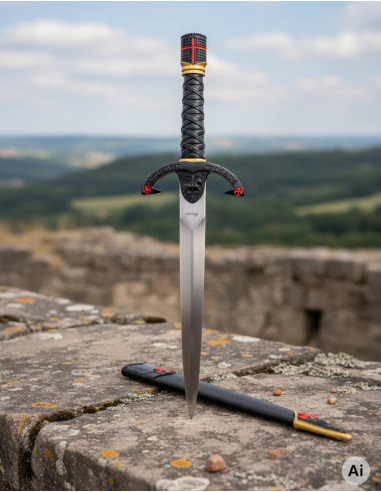 La impugnatura nera con design intrecciato e la finitura nera di tutta la guaina, decorata con croci templari in rosso, ti conferiscono un aspetto imponente e ricco di significato. Con una lunghezza totale di 40 cm e la sua lama di 24 cm in acciaio lucido di 2,3 mm di spessore, potrai esibirla con orgoglio o usarla come pezzo centrale nella tua collezione. Il suo peso di 313 grammi la rende comoda e facile da maneggiare per l'esposizione. La scheda immagine mostra che, oltre alla sua bellezza decorativa, la spada presenta dettagli dorati, iscrizioni di crociati e un simbolo templare, che riflettono la sua ispirazione nella storia dei cavalieri crociati.