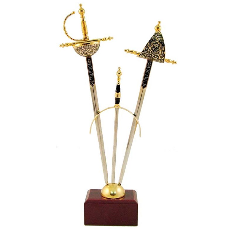 Queste spade non sono semplici opere d'arte, ma strumenti di presenza. Con un'altezza di 22 cm e una larghezza di 12 cm, sono progettate per risaltare in ogni spazio, elevando il tuo status senza urlarlo. Il metallo resistente, forgiato proprio a Toledo, garantisce durabilità e affidabilità, mentre il supporto elegante ti permette di esporle con orgoglio. Integrando questo set nella tua collezione, riaffermi il tuo retaggio e il desiderio di connetterti con una tradizione forgiata nel fuoco e nella precisione. È l'opportunità di trasformare uno spazio in un simbolo tangibile del tuo carattere e leadership.