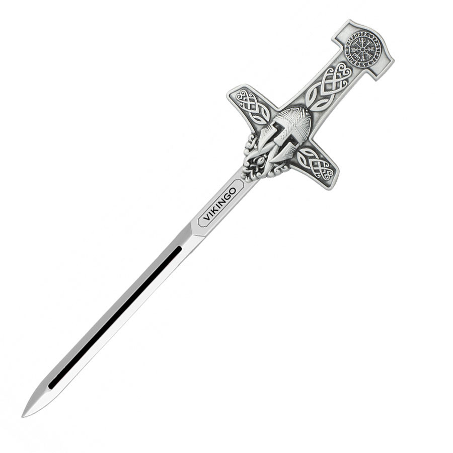 Figura di guerriero vichingo con scudo e spada, in resina