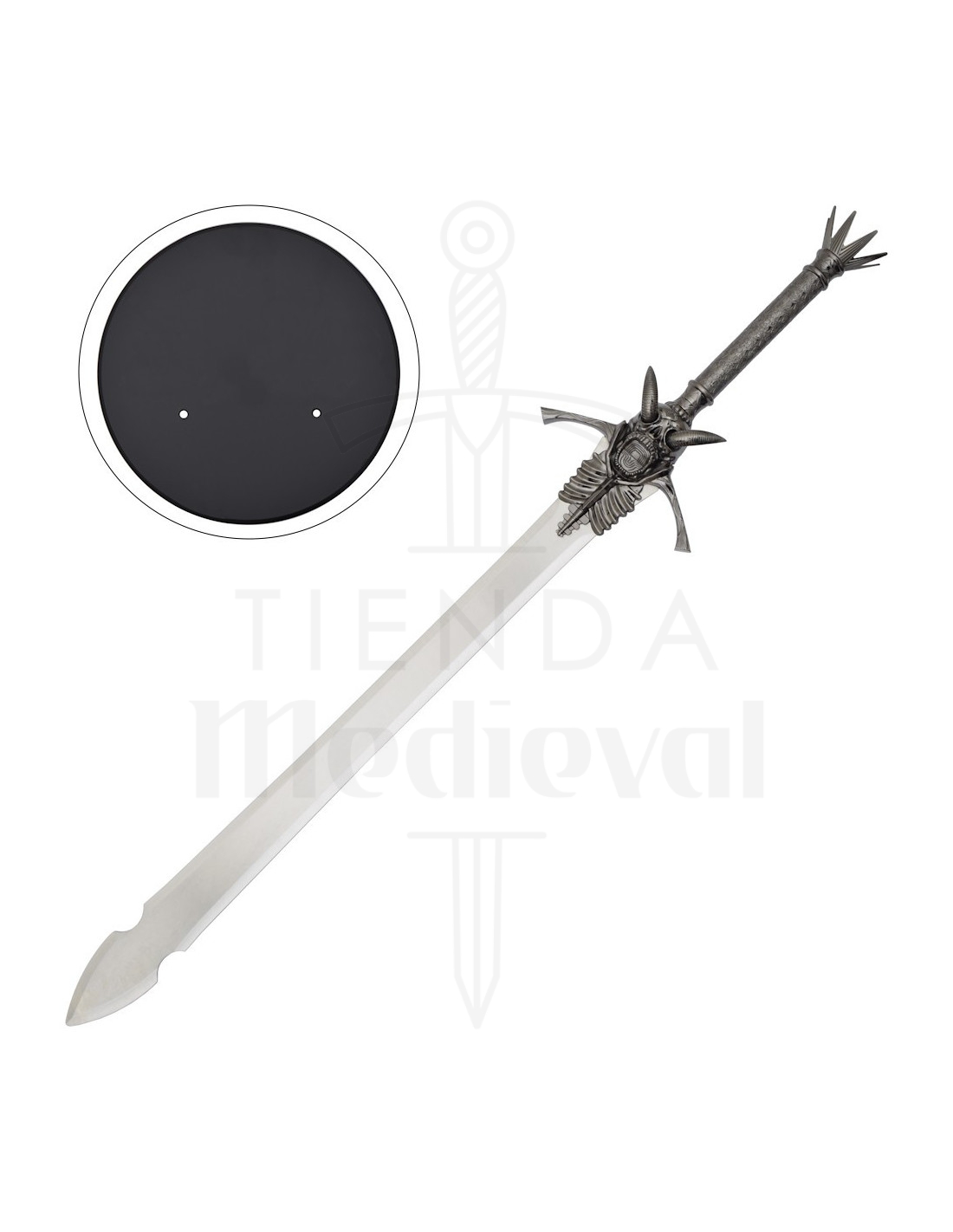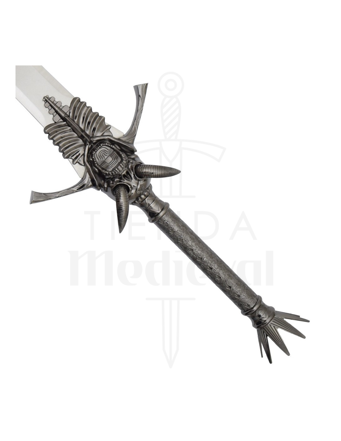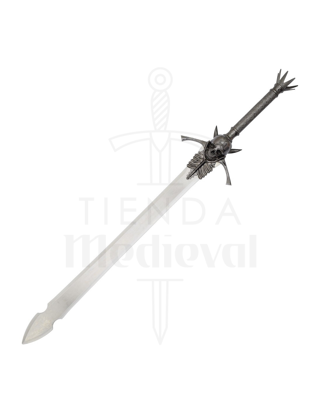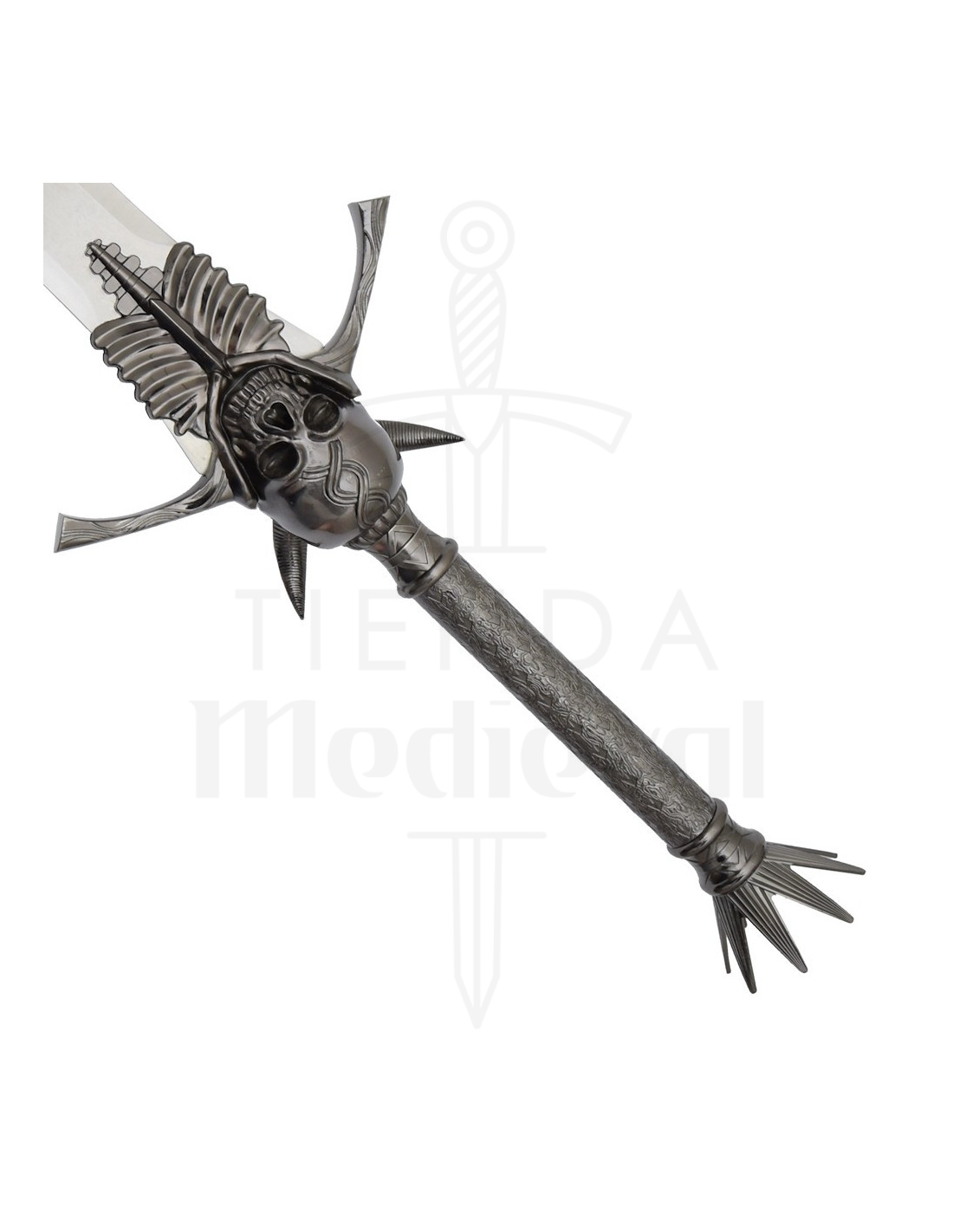 Il design non è solo estetico, facilita anche l'esperienza: l'impugnatura scura e testurizzata offre una presa salda per posarla o tenerla in sicurezza, mentre la guardia decorata con teschio e costole, e le punte laterali, aggiungono carattere e una sensazione teatrale che esalta ogni foto o esposizione. La corona di punte sulla punta del manico aggiunge quel colpo drammatico che definisce il suo stile gotico e decorativo.