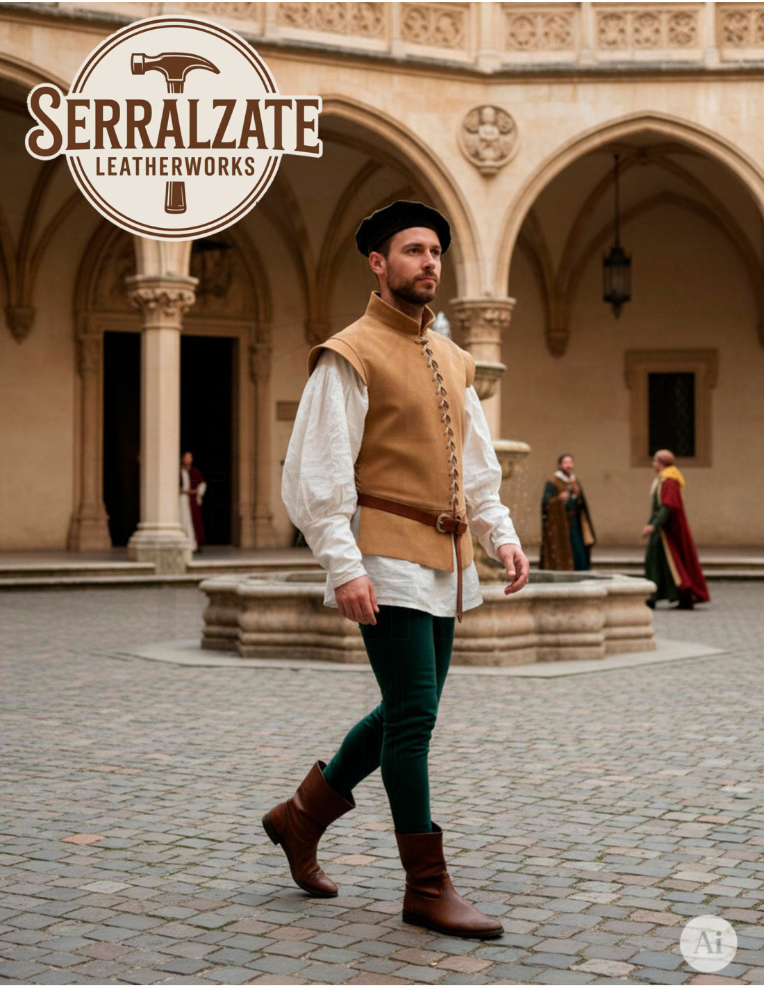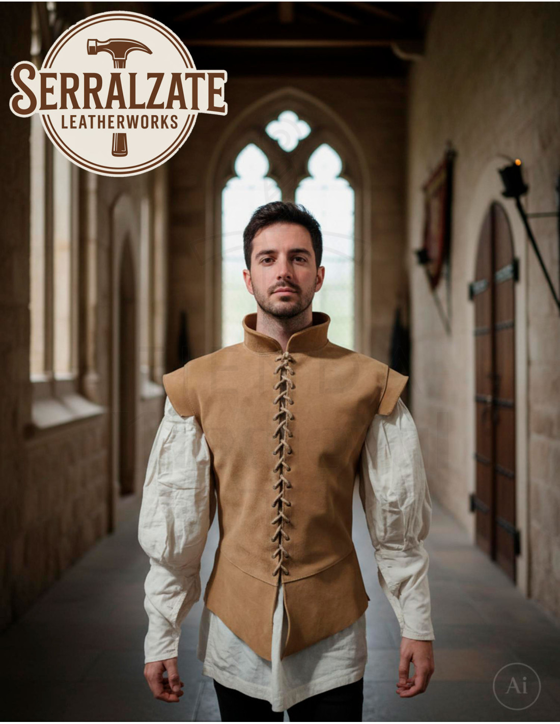 Se desideri acquistare un Giubbotto medievale e rinascimentale in pelle scamosciata marrone chiaro, questa è un’insieme che promette di trasformare il tuo aspetto con carattere e sicurezza, aggiungendo un tocco di eredità e artigianalità in ogni cucitura.