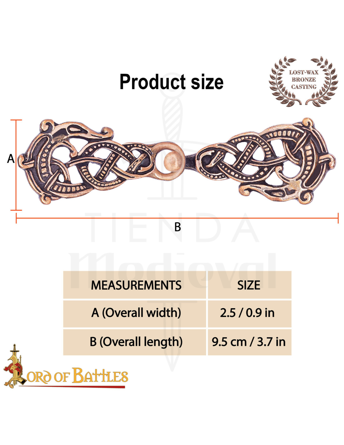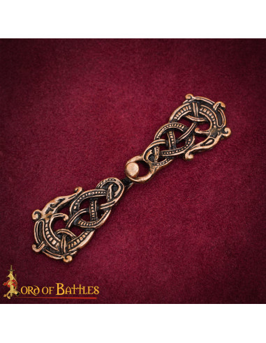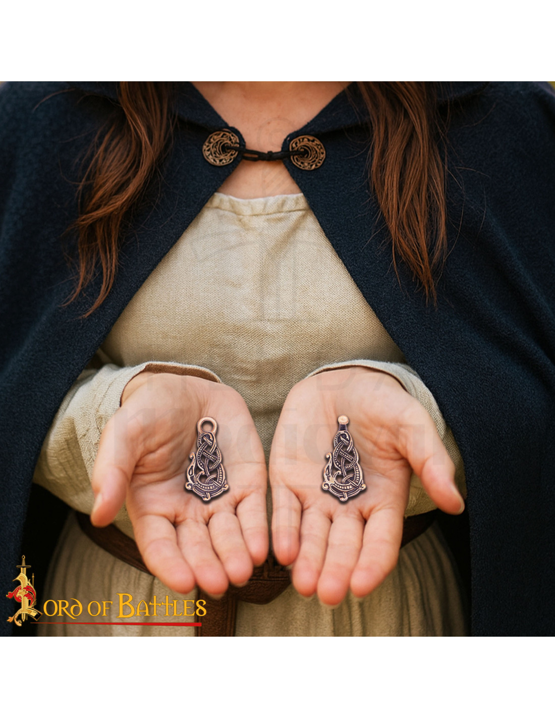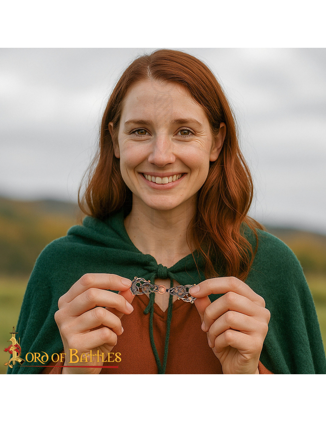 Sulla superficie, le tonalità di bronzo e nero risaltano il rilievo e i puntini che decorano il corpo intrecciato, mentre le due teste di drago agli estremi apportano un simbolo di forza e protezione, tanto apprezzato nella scenografia nordica dei secoli IX e X. Se apprezzi la fedeltà storica, questa chiusura rimanda ai pezzi che accompagnavano capi, commercianti e marinai scandinavi dell'epoca.