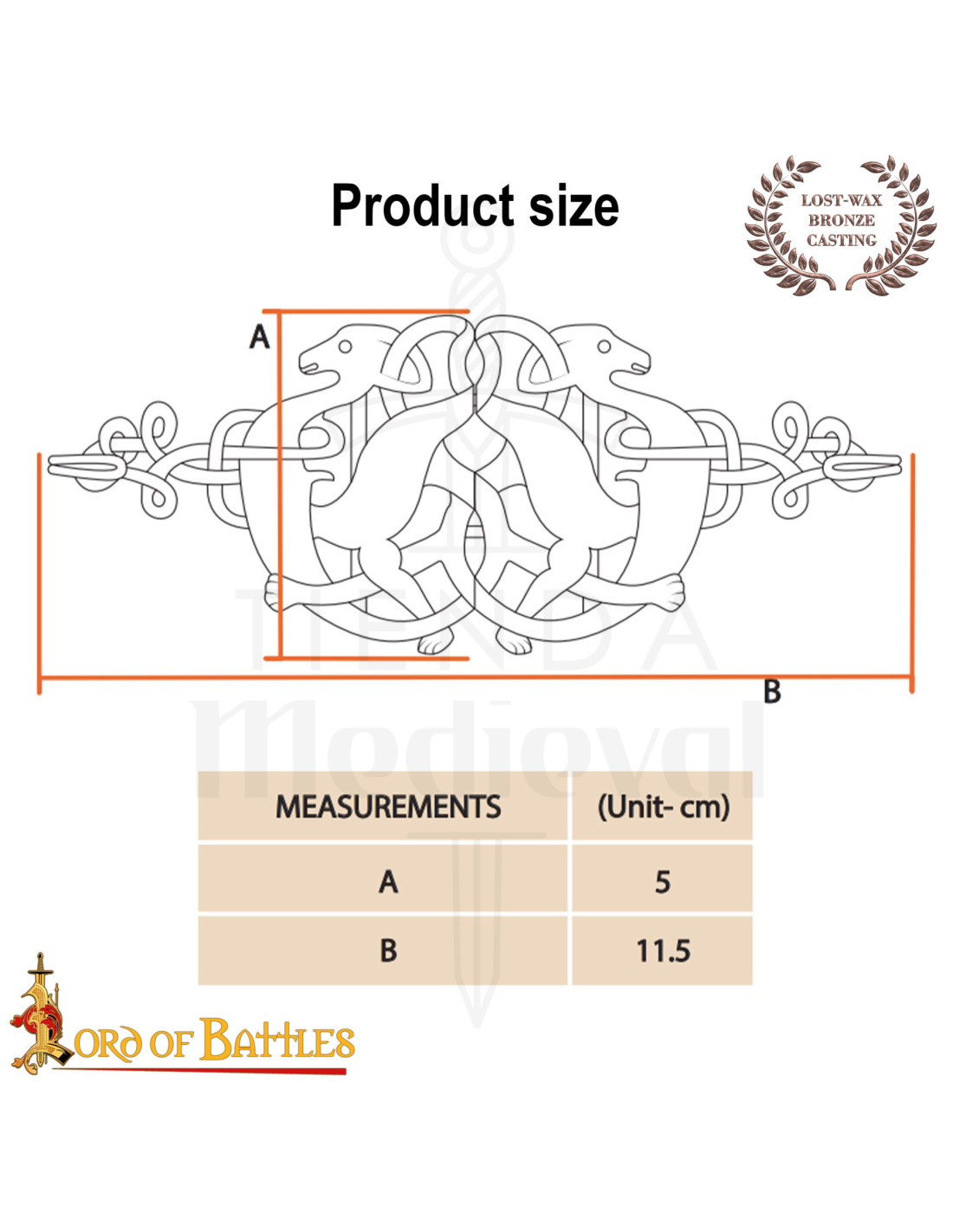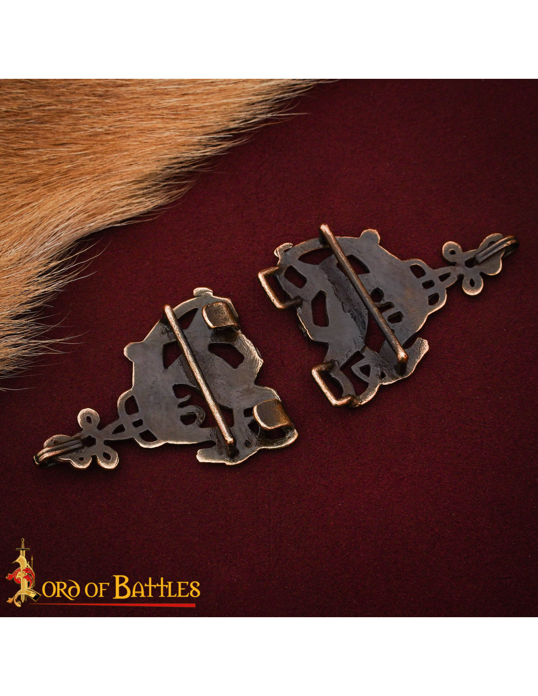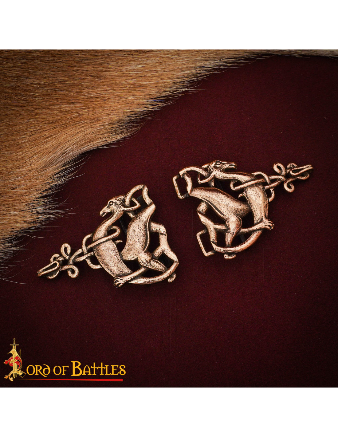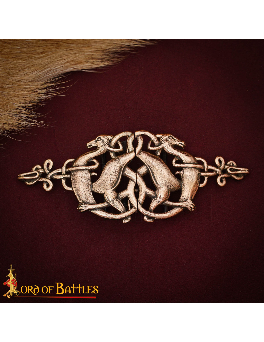 Con un motivo celtico di cervi intrecciati, le figure di fronte e l’intreccio di nodi trasmettono movimento ed eleganza, mentre le linee che simulano la texture ricordano la pelle e il pelame stilizzato di antiche opere medievali. Nella fotografia, il bagliore opaco del bronzo su una stoffa bordeaux intensifica la sua presenza, facendolo risaltare anche in scene sobrie.
