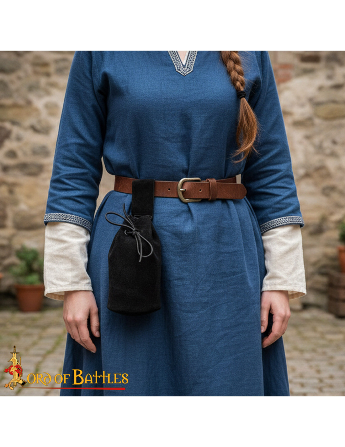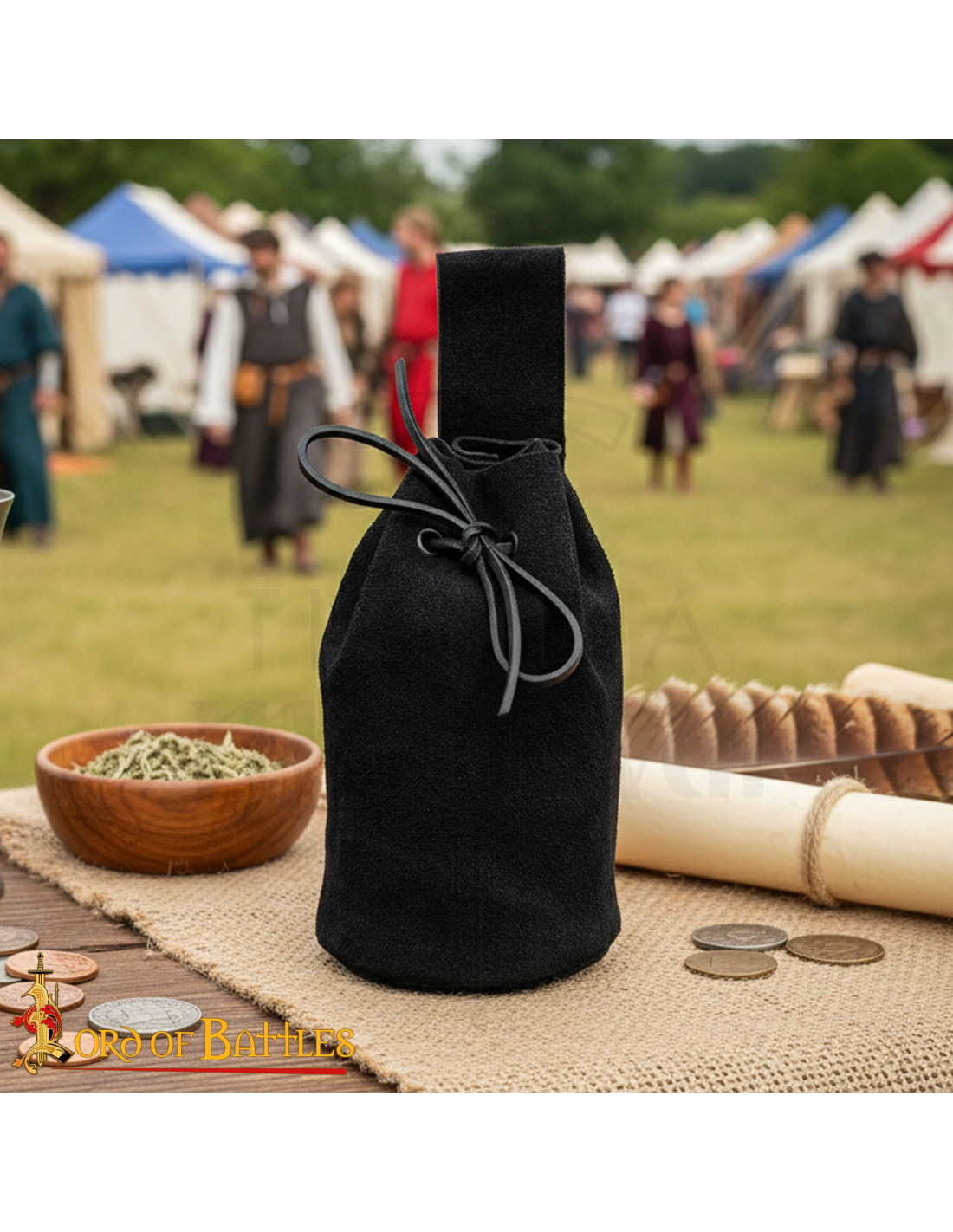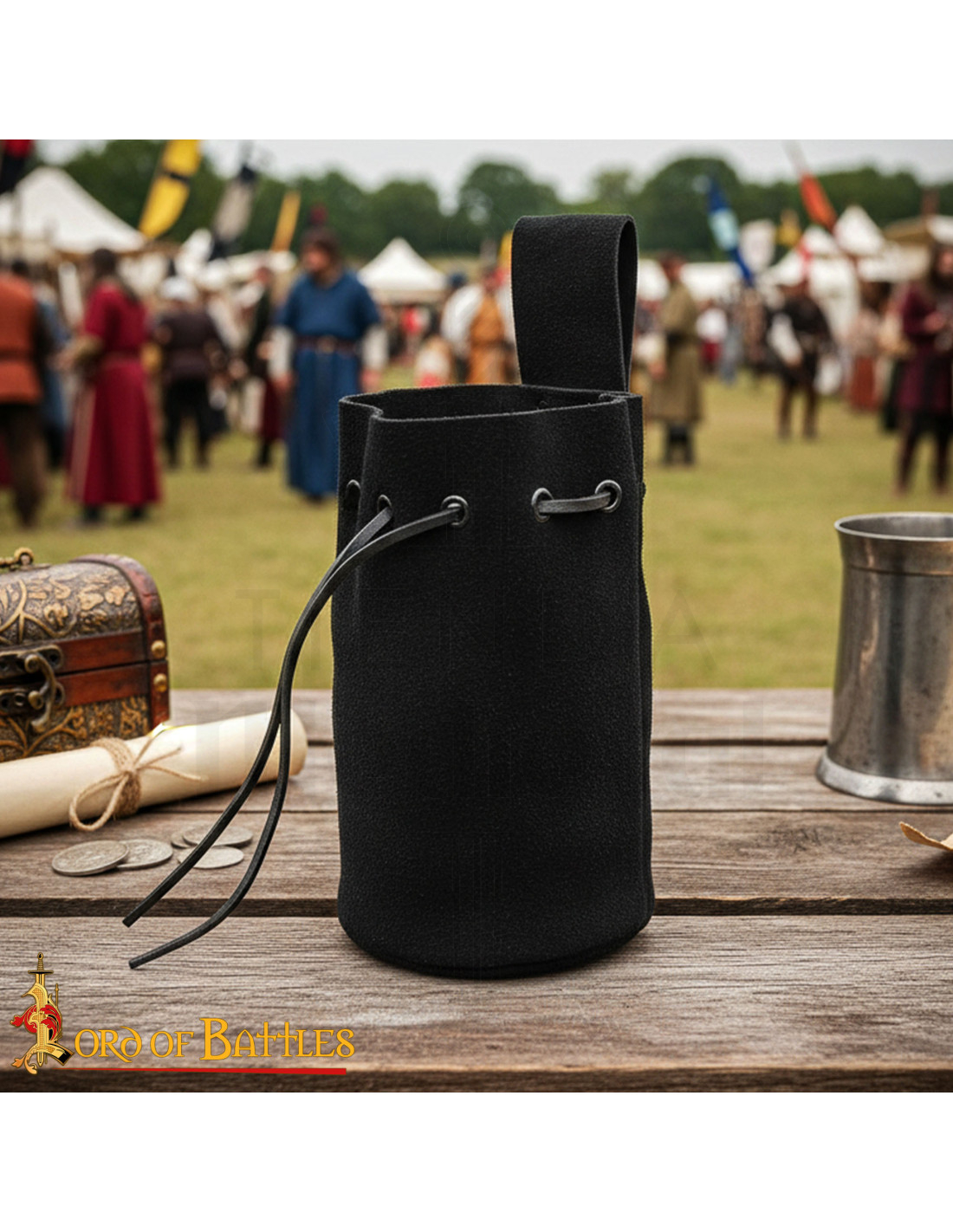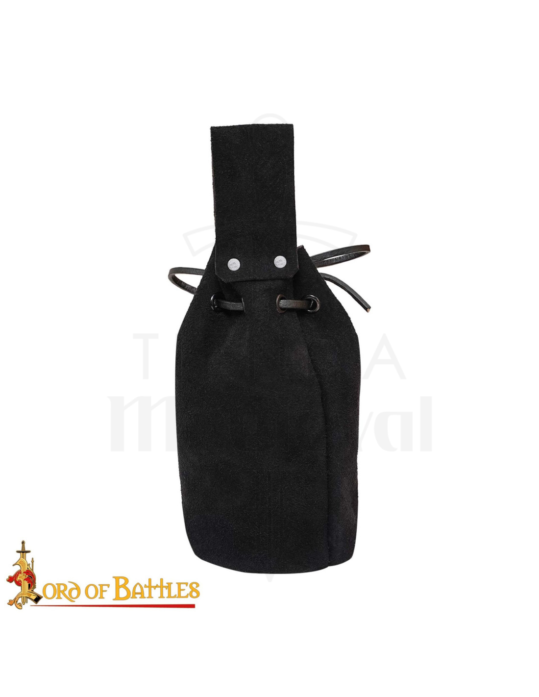 Il finissaggio nero conferisce versatilità, abbinandosi a costumi storici o look urbani contemporanei. L'unione tra cordoncino e pelle crea una chiusura che protegge i tuoi oggetti personali, e la lavorazione pensata per un uso ripetuto garantisce una sensazione di resistenza senza perdere quella piacevole texture al tatto.