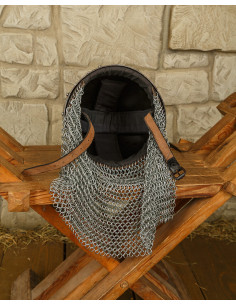 - Cotta di maglia incorporata: la cotta di maglia che protegge la zona del collo e del torace è integrata nel casco, fornendo una protezione completa e un aspetto autentico.