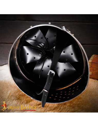 - Durata leggendaria: realizzato in resistente acciaio calibro 1 mm/19 con finitura in ottone anticato, questo casco è progettato per resistere alla prova del tempo e ai rigori del combattimento. La sua resistenza e durata sono il risultato di un lavoro artigianale meticoloso e dedicato, che riflette la qualità e l'eccellenza delle antiche tecniche di produzione.