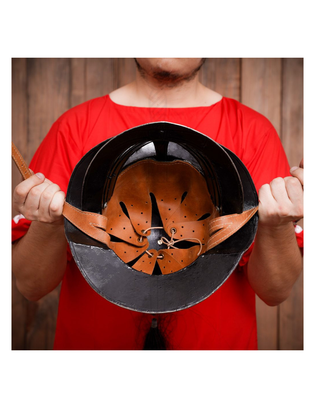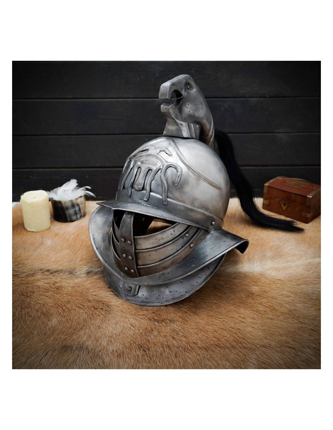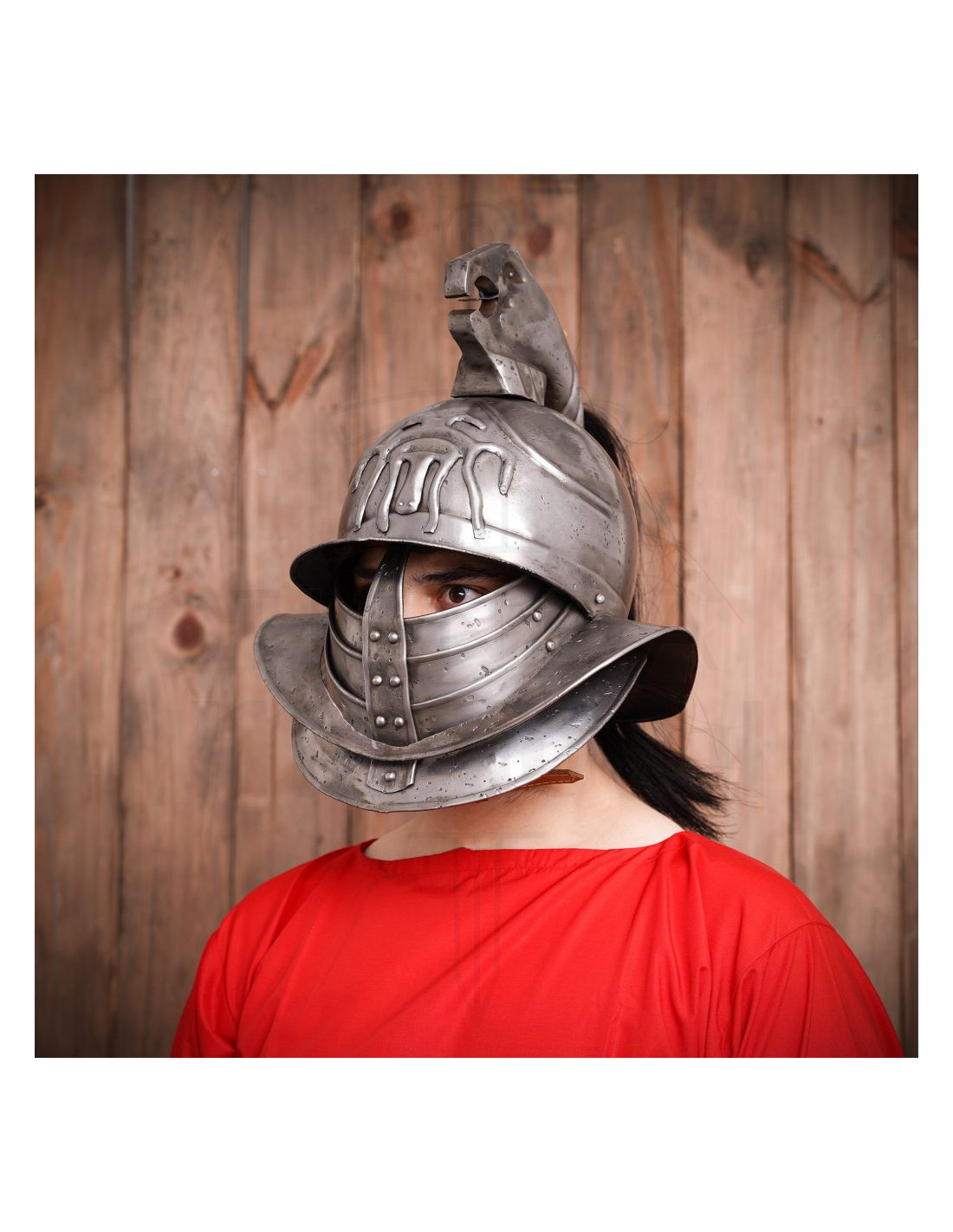 Il visore mobile e la ampia ala frontale non solo rinforzano il suo aspetto fedele alle armature antiche, ma aggiungono funzionalità permettendo di modulare la protezione del viso e della silhouette a seconda dell'occasione, da esposizioni a eventi di rievocazione. La struttura offre una copertura realistica per la testa e le guance, con dettagli ribattuti che ne esaltano la veridicità visiva.