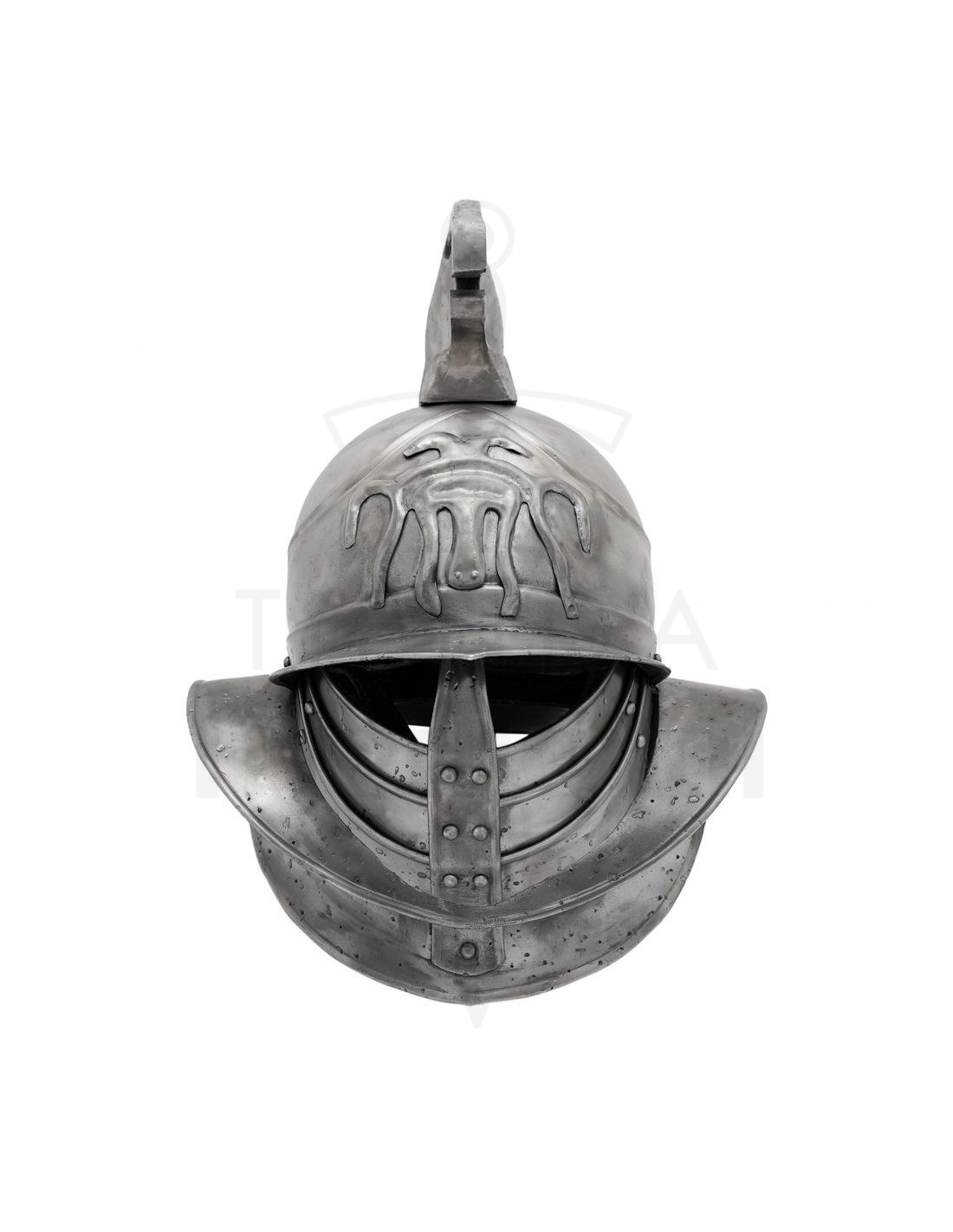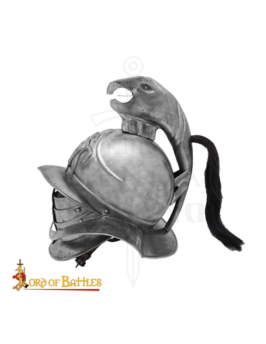 Questo design scolpito in acciaio offre una presenza imponente che parla di resistenza e carattere, grazie alla sua finitura invecchiata che simula i segni di battaglia e conferisce un aspetto autentico e drammatico. La cresta a forma di aquila e il rilievo frontale apportano quel sigillo simbolico di potere e sfida, rendendo il casco un pezzo che attrae sguardi e suscita storie.