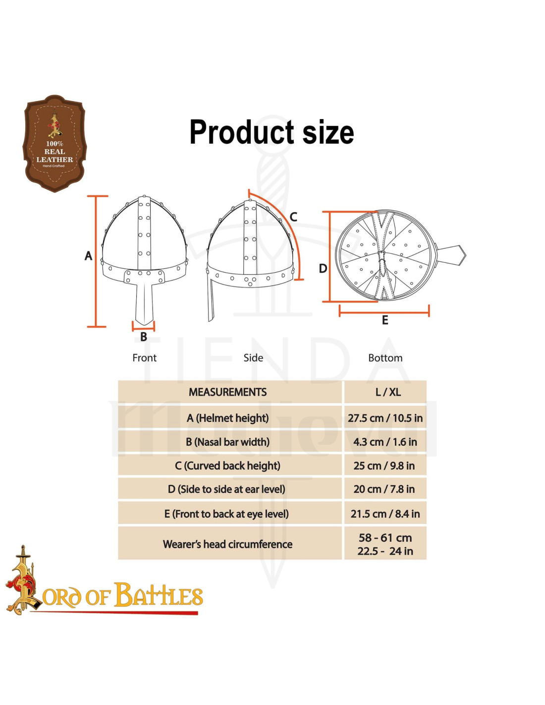 Con un peso di circa 2,5 kg, questo casco è resistente ma maneggevole, ideale per cosplay, ricostruzioni storiche o collezionismo. Ispirato al periodo della conquista normanna dell'XI secolo, il suo finitura argentata e i dettagli dei rivetti lo rendono un pezzo autentico che si distingue in qualsiasi esposizione. Inoltre, il marchio 'Lord of Battles' garantisce qualità e fedeltà alla storia.