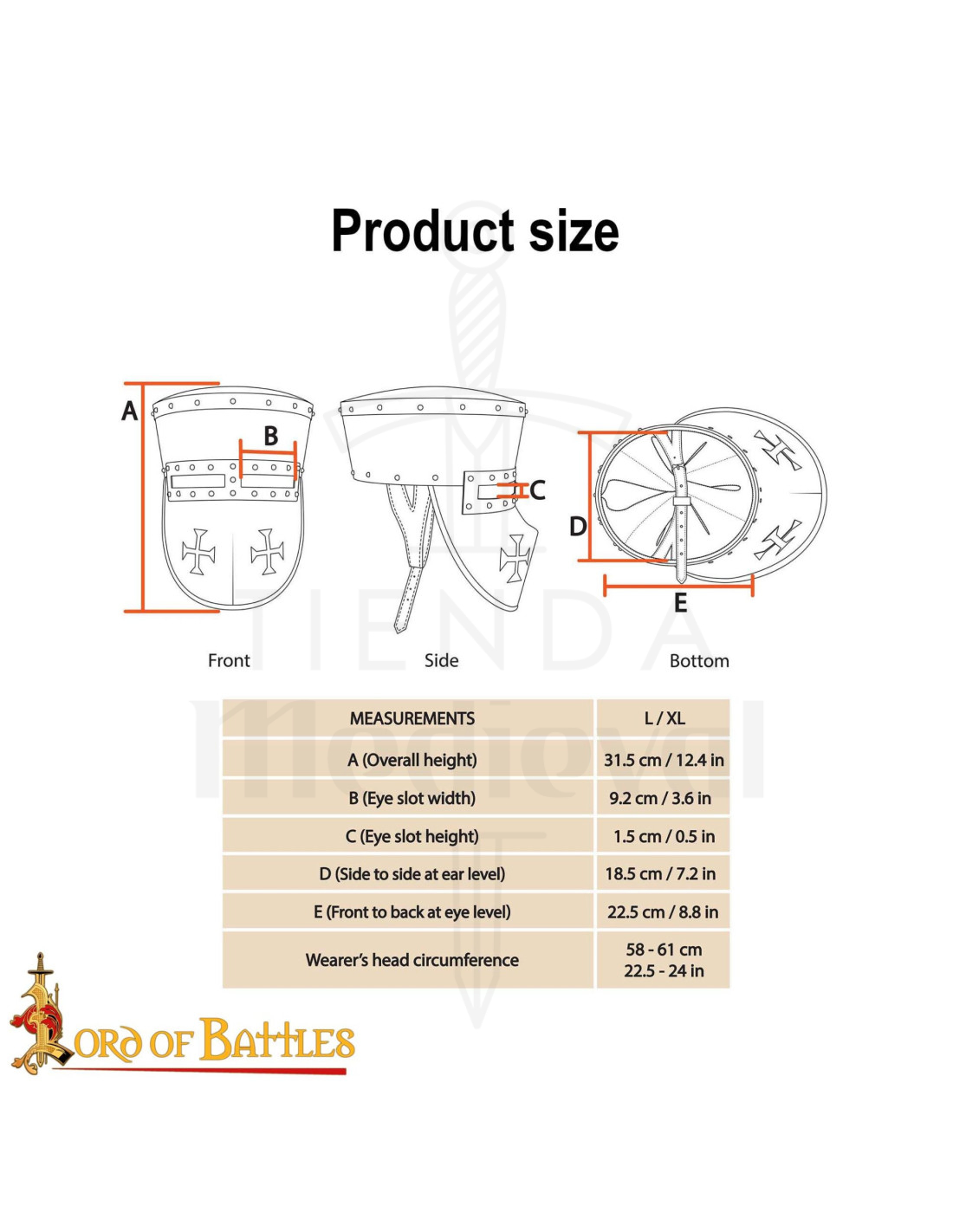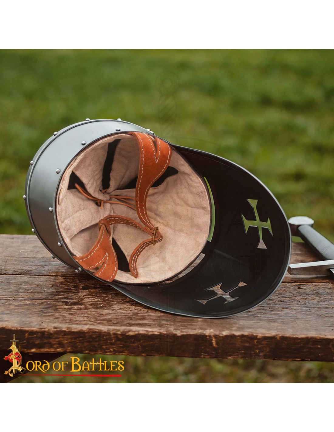 Oltre alla funzione protettiva, questo casco diventa un chiaro simbolo di identità e cavalleria medievale. Completalo con un manto e accessori medievali per potenziare il tuo look e la tua esperienza storica. Un elemento indispensabile per chi desidera rivivere l'eroismo dei cavalieri templari con autenticità e stile.
