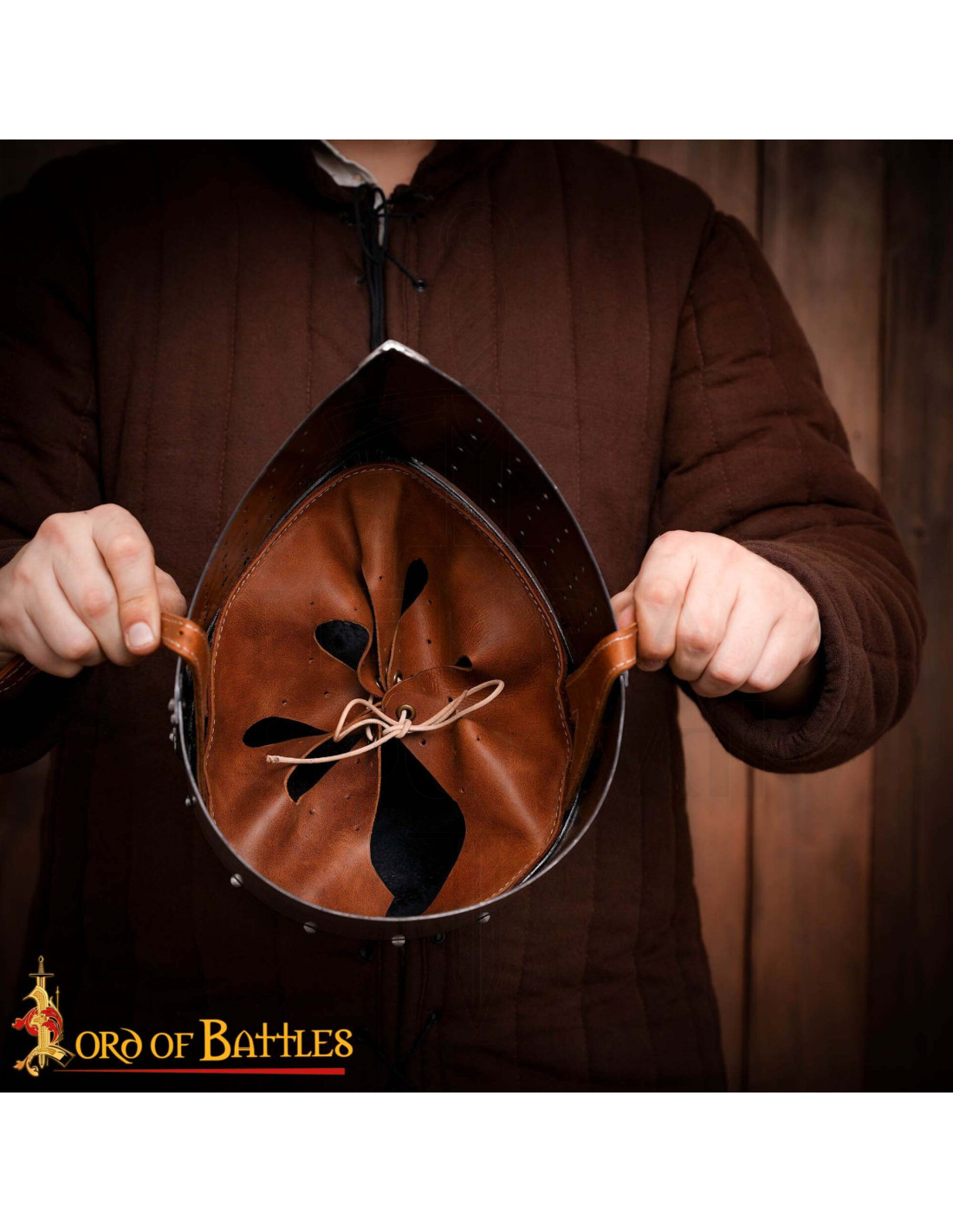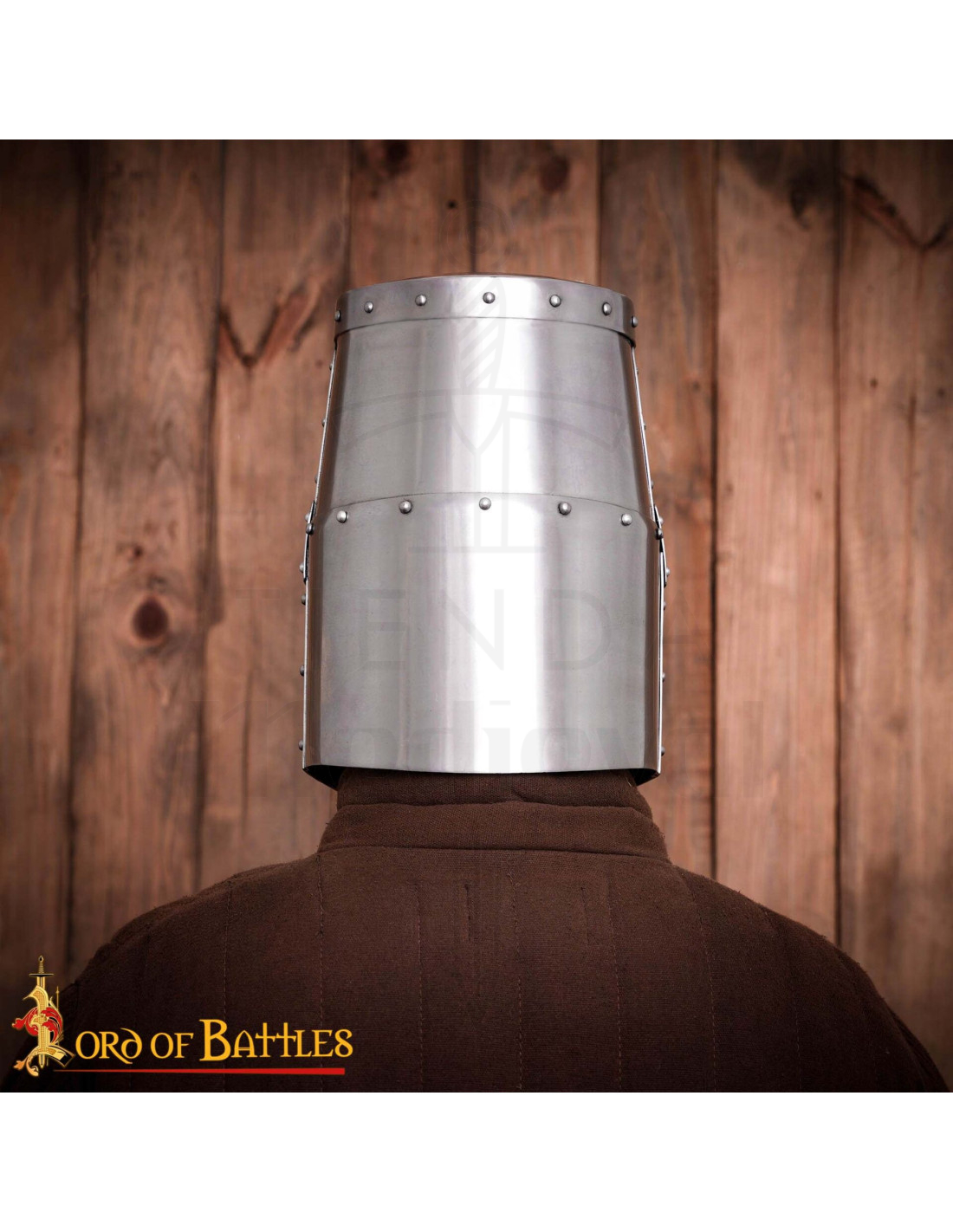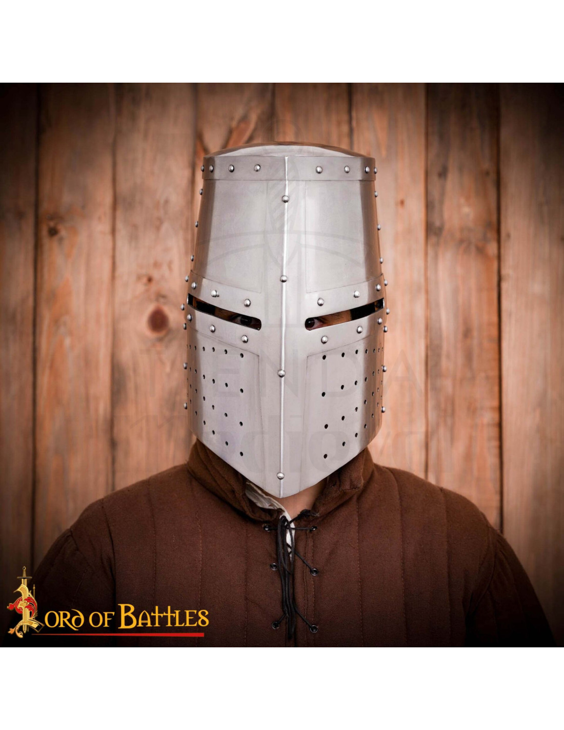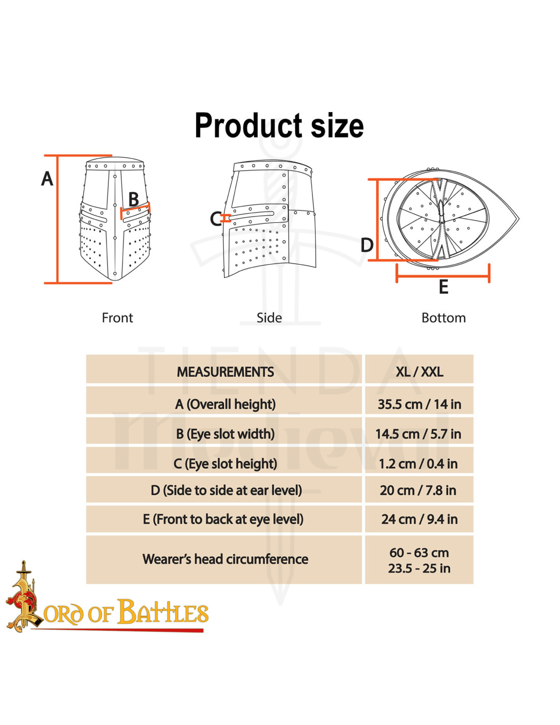 Su diseño inspirado en los siglos XIII y XIV cubre completamente la cabeza, con una estructura que permite una visión clara a través de sus amplias hendiduras oculares, de más de 14 cm de largo, y ventilación mediante perforaciones que facilitan la comodidad durante su uso. Gracias a su forro de cuero, se ajusta perfectamente a tu cabeza, brindando confort y absorbiendo los golpes en el combate, además de facilitar el alineamiento de la visión.