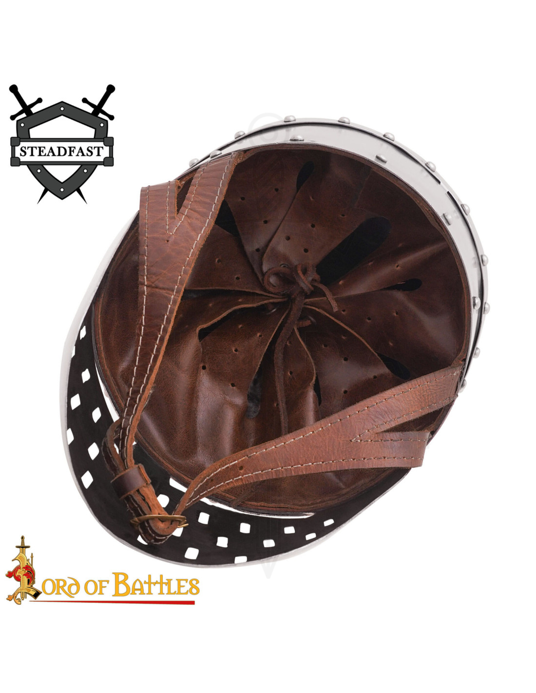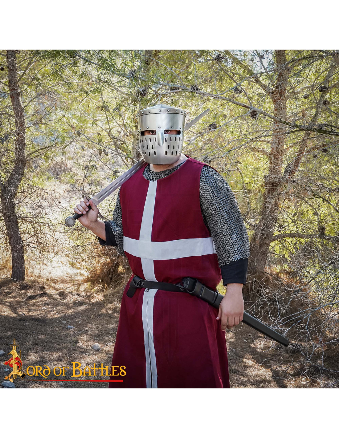 Hai mai sognato di sentirti come un autentico cavaliere del Medioevo? Questo casco da cavaliere crociato ti trasporta direttamente nelle battaglie del XIII secolo, offrendoti una protezione leggendaria e uno stile che evoca il coraggio e l’onore dei guerrieri medievali. Realizzato in resistente acciaio di alta qualità, la sua finitura lucida e dettagli come i rivetti classici riflettono un’autentica artigianalità, garantendo una presenza imponente e durabilità in ogni avventura.