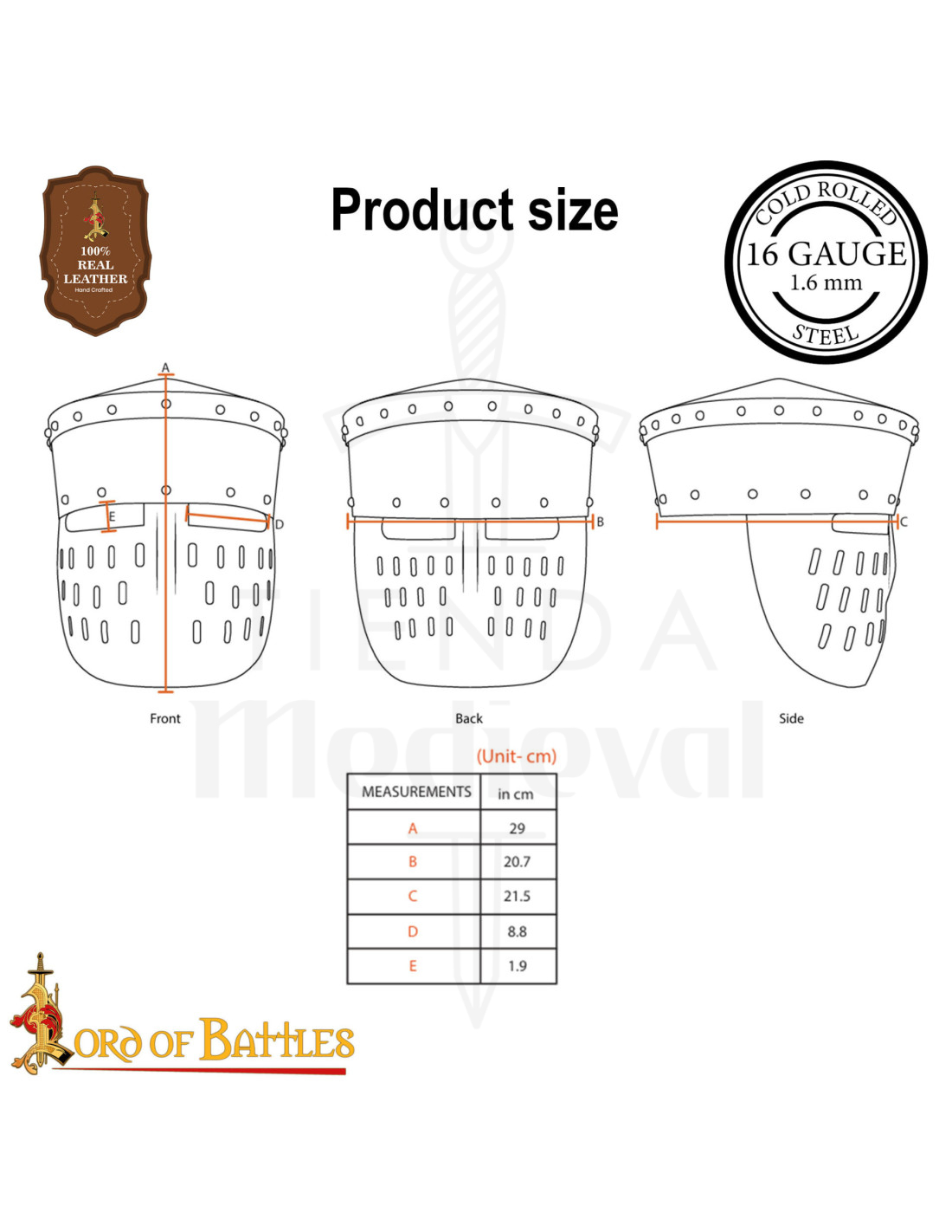 Con un peso equilibrato, questo casco si adatta comodamente alla testa degli adulti, adattandosi a diverse taglie con una circonferenza interna fino a 68 cm. È perfetto per reenactment, cosplay o esposizioni, permettendoti di connetterti con la storia e rivivere lo spirito coraggioso dei cavalieri crociati. Inoltre, la sua finitura con uno strato di olio temporaneo protegge dall’ossidazione, mantenendo lucentezza e resistenza nel tempo. Ti basterà un panno asciutto per mantenerlo impeccabile.