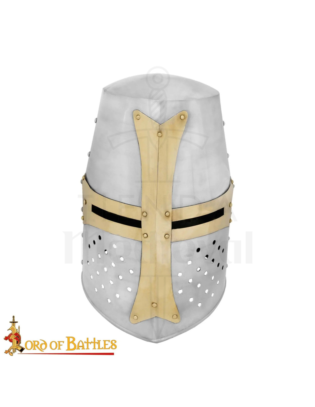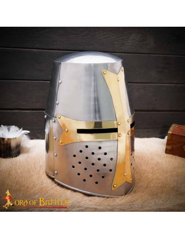 Questo elmo ispirato all’epoca delle Crociate riflette il coraggio e il sacrificio dei cavalieri medievali, rappresentando un pezzo che valorizza la tradizione e l’arte dell’armatura antica. Perfetto per completare il tuo abbigliamento storico e distinguerti in qualsiasi evento di ricostruzione o esposizione.