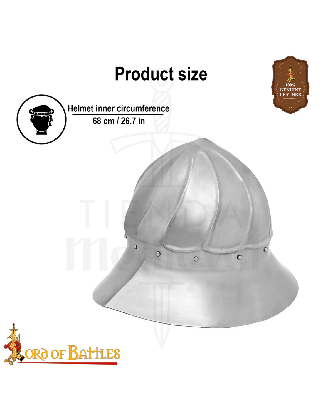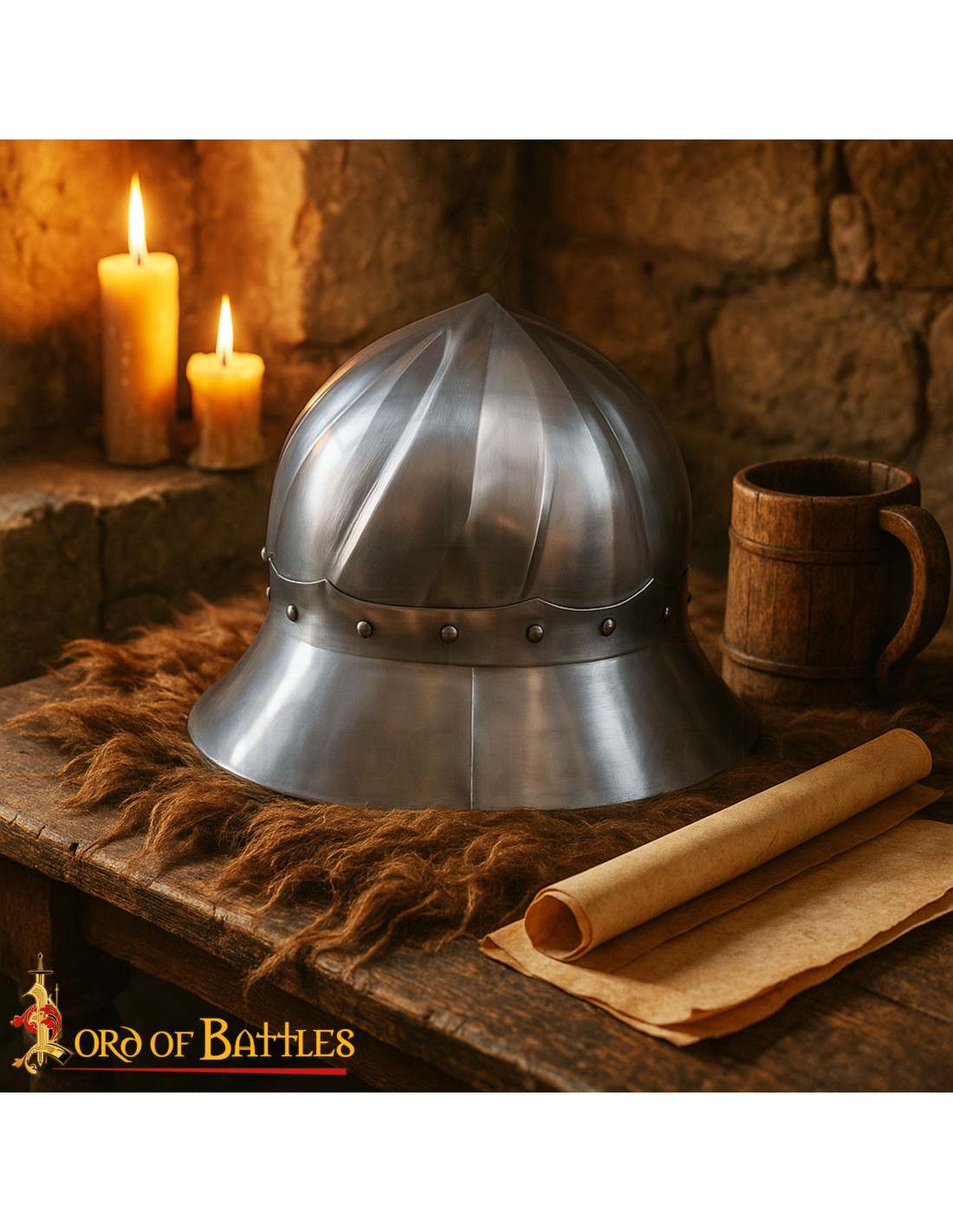 Collocato su un supporto rustico con candele e pergameni, l'elmo proietta un'estetica fedele alla sua origine nei Paesi Bassi borgognoni, evocando le file di picchieri e balestrieri che lo usavano per la sua capacità di deviare colpi e proiettili. È perfetto sia per l'esposizione in musei ed eventi di patrimonio, sia per chi desidera acquistare una riproduzione robusta e con presenza storica.