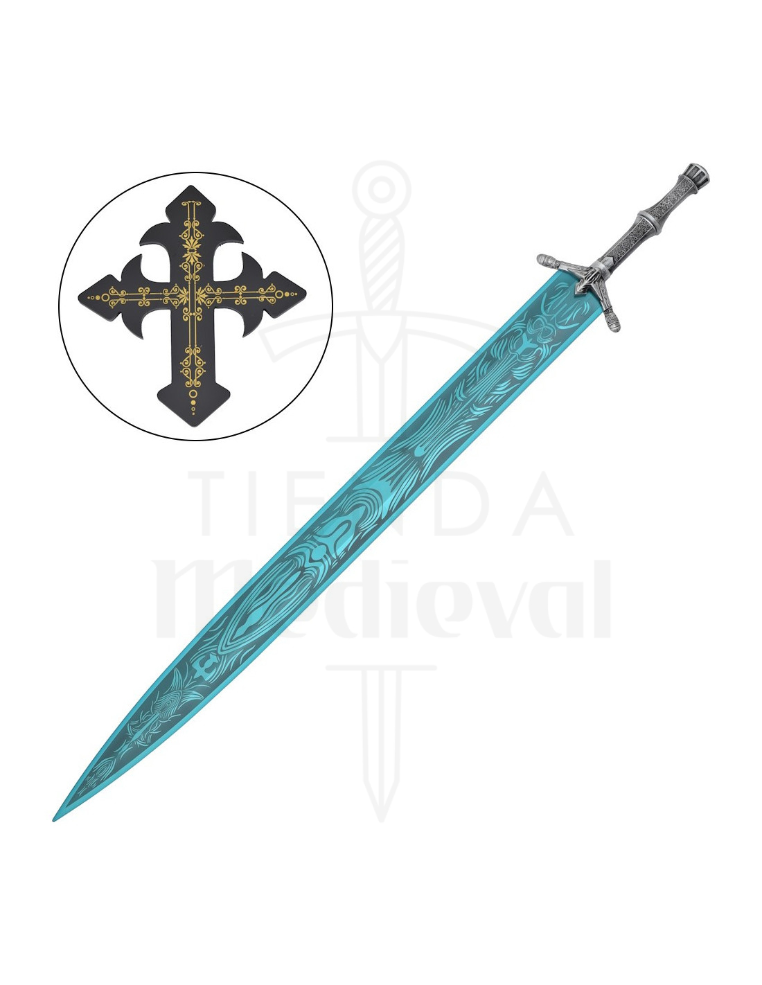 Il manico metallico, con rilievi ornamentali e una guardia a doppia croce con terminazioni a forma di freccia, apporta un tocco dettagliato e un'estetica elegante, rendendo il suo utilizzo o il suo esibire l'elevato la presenza di qualsiasi vetrina o parete.