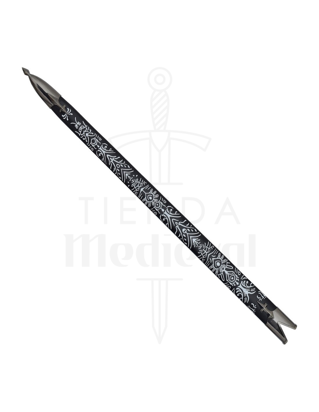 Il fodero in legno, decorato con un motivo bianco in stile tribale e finiture metalliche scure, protegge il pezzo e funge da complemento estetico, creando un contrasto visivo che attira gli sguardi. Il supporto a parete incluso facilita il montaggio e il cambiamento della sua posizione con rapidità, permettendoti di esporlo come centro decorativo senza complicazioni. Il supporto opaco con un emblema rosso stilizzato accentua l'atmosfera, formando un insieme armonico e con identità propria.