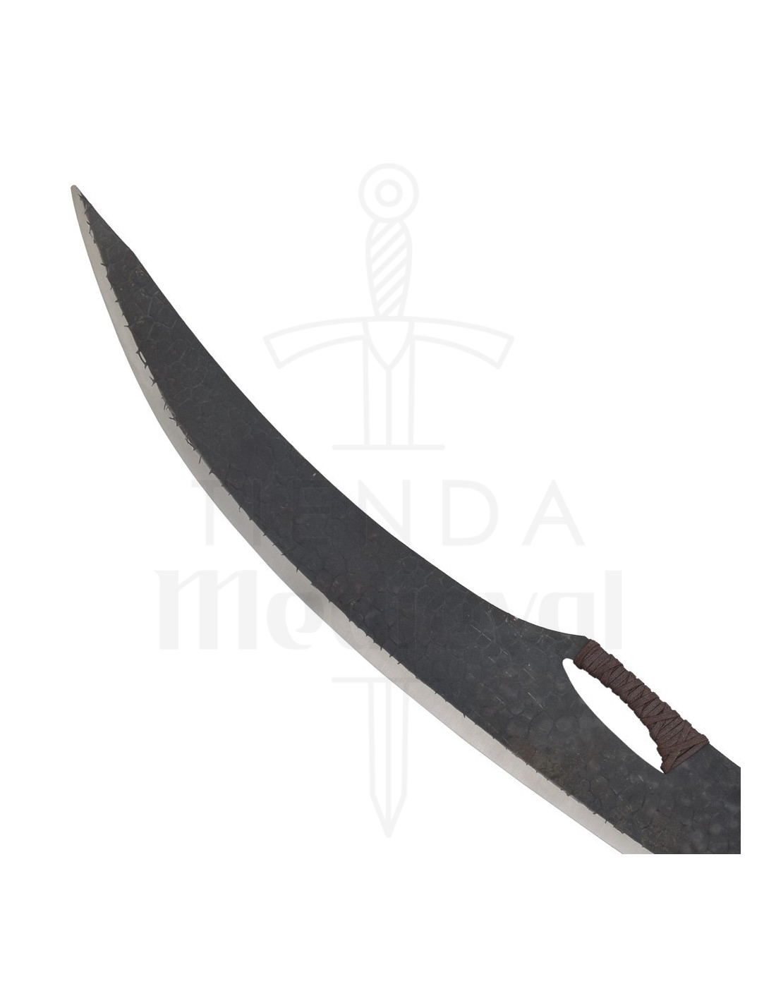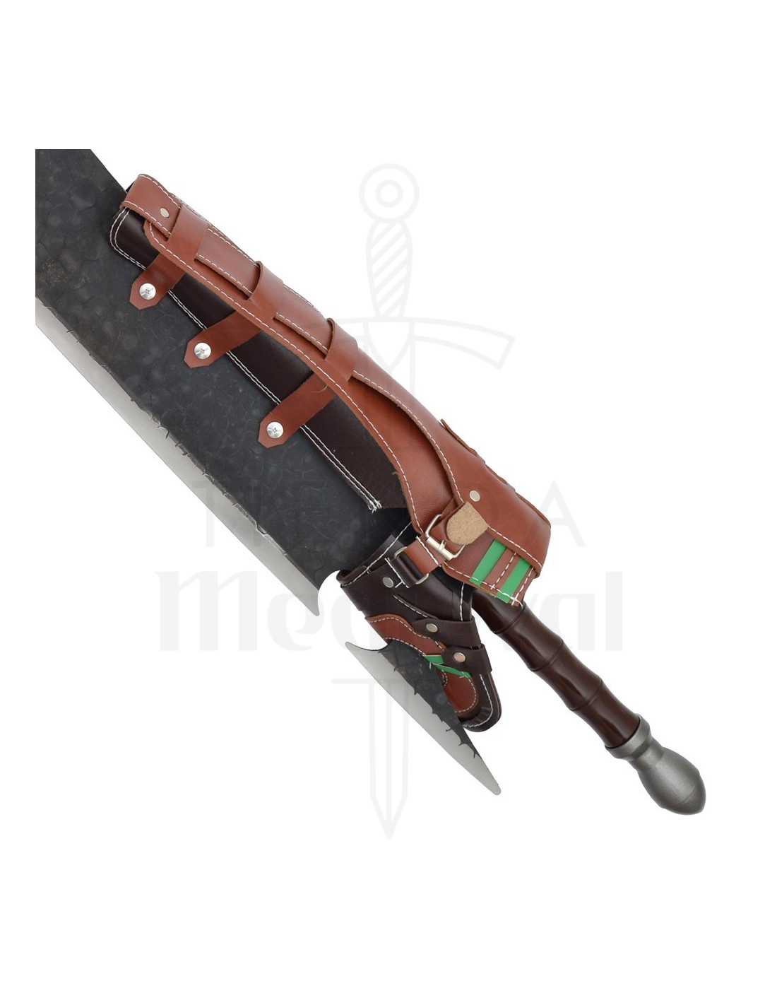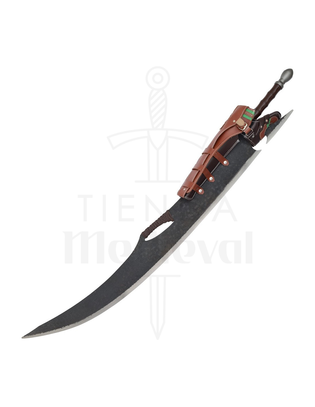 Con un design che rispetta l'estetica del gioco, questa replica offre una presenza imponente senza rischiare la sicurezza, grazie alla sua lama smussata progettata esclusivamente per scopi ornamentali. Quell'aspetto metallico testurizzato in nero e l'apertura decorativa accanto al manico conferiscono autenticità visiva, mentre le parti in corda e cuoio sintetico aggiungono carattere e realismo all'insieme.