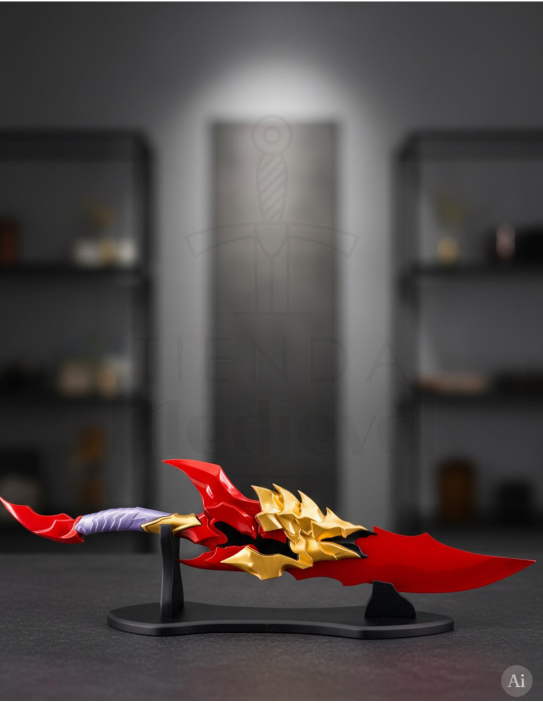 Inoltre, include un supporto resistente che facilita il posizionamento ovunque, rendendola un pezzo da esposizione impressionante. Con un peso di 1495 g, le sue dimensioni e il suo peso la rendono facile da maneggiare ed esibire senza sforzo. L'aspetto si distingue per le finiture in rosso e oro, dettagli in rilievo e uno stile che evoca potere e carattere. Perfetta per collezionisti, appassionati di Solo Leveling o amanti della decorazione a tema, questa spada decorativa porta la tua passione per l'universo di fantasia e azione a un altro livello. Acquista subito la replica dell'Ira di Kamish e dona un tocco epico al tuo spazio!