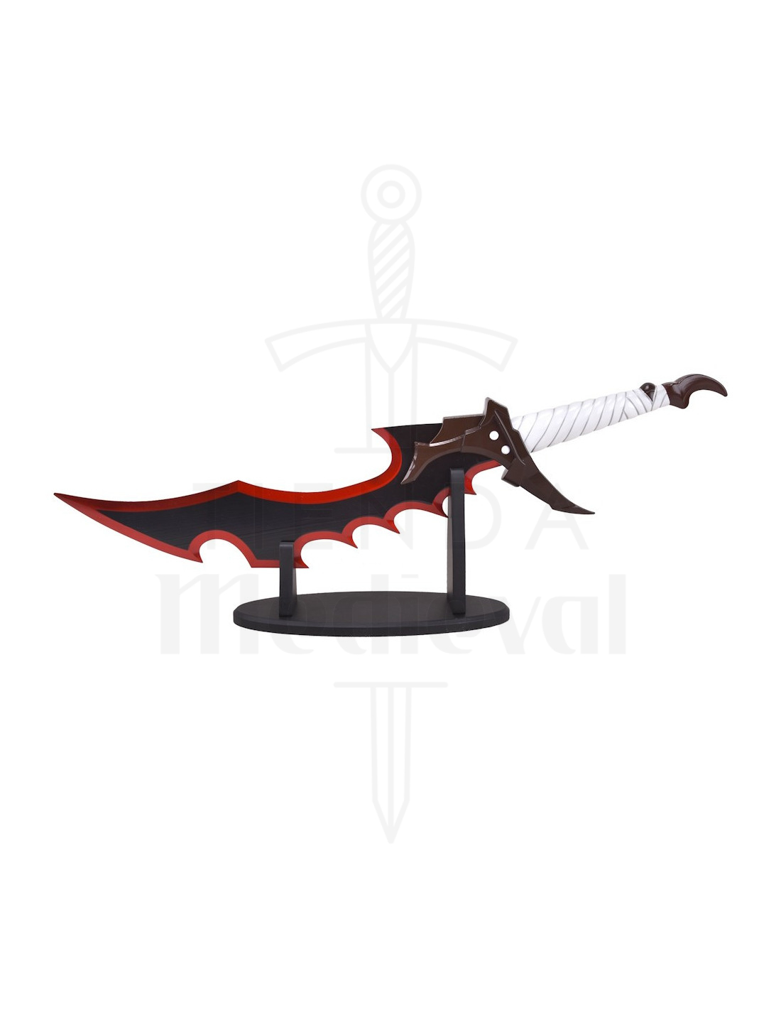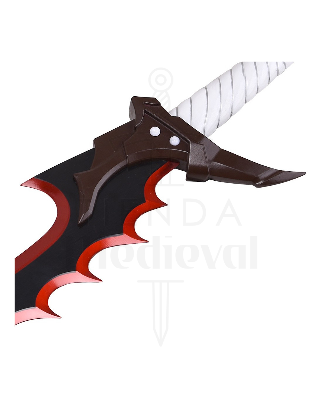 La Replica Pugnale Sung Jinwoo Solo Leveling con supporto porta quell'aura drammatica grazie alla sua lama nera con bordi rossi e un filo irregolare pieno di intagli e punte, creando una finitura aggressiva e teatrale che si distingue su qualsiasi mobile.