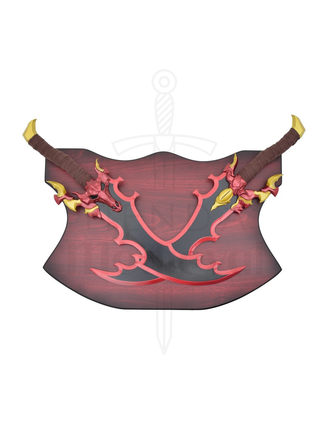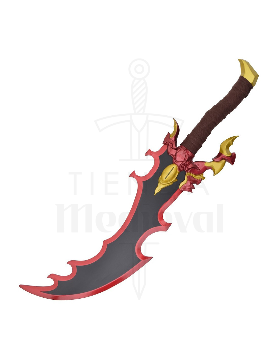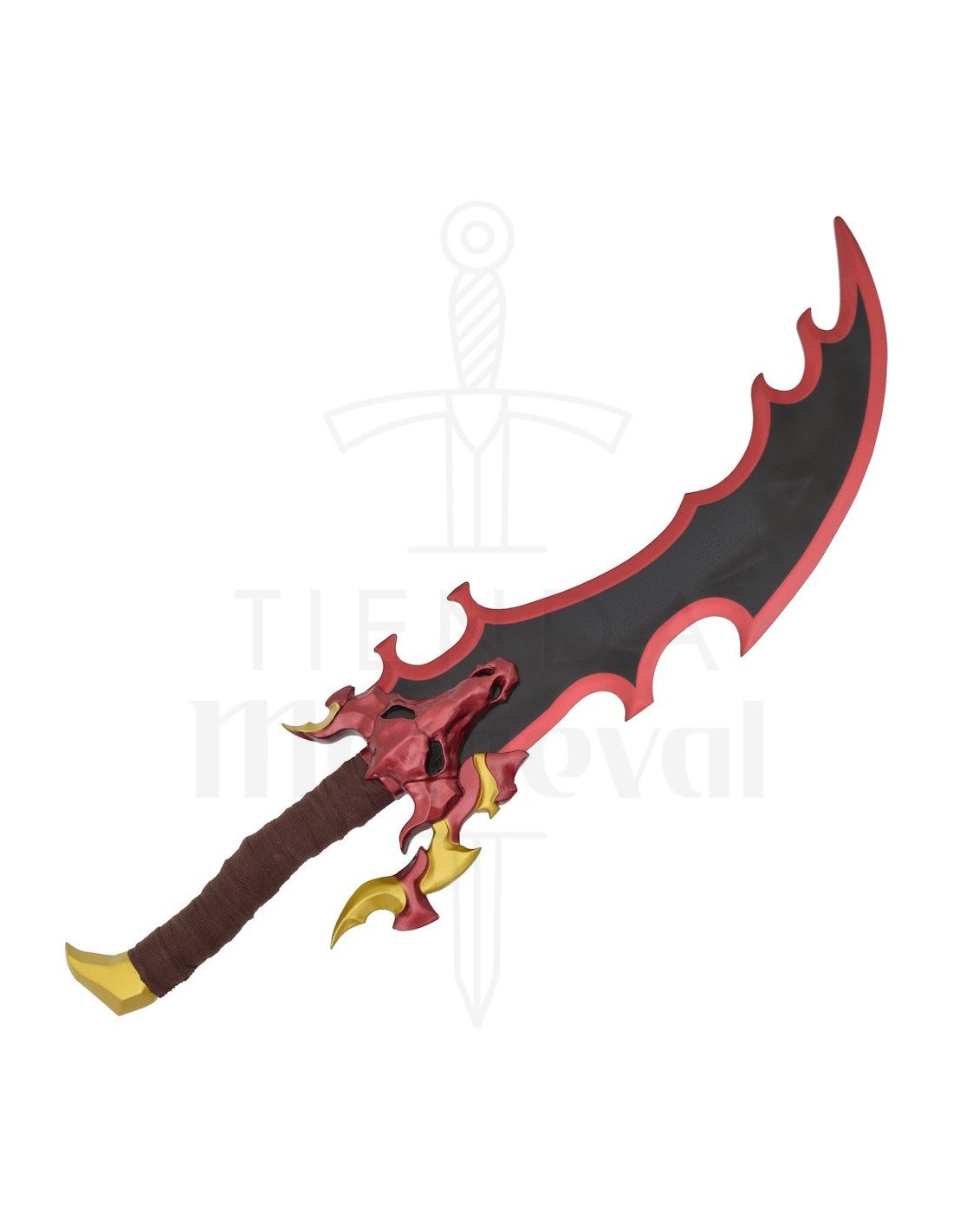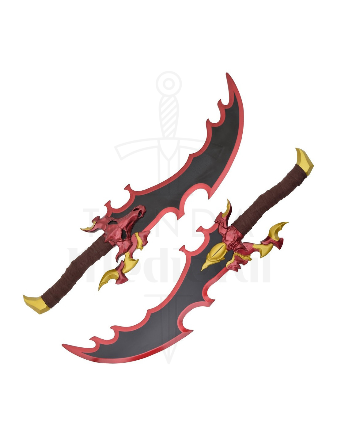 I manici, avvolti in un tessuto marrone, offrono una presa comoda e una sensazione autentica al tatto, ideali per manipolarli durante sessioni fotografiche o per posizionarli facilmente. Le guardie rosse con dettagli dorati, e la figura a forma di testa di creatura su uno di essi, aggiungono carattere e un'aria mitologica, offrendo una personalità propria che si collega a narrazioni di potere e mistero.