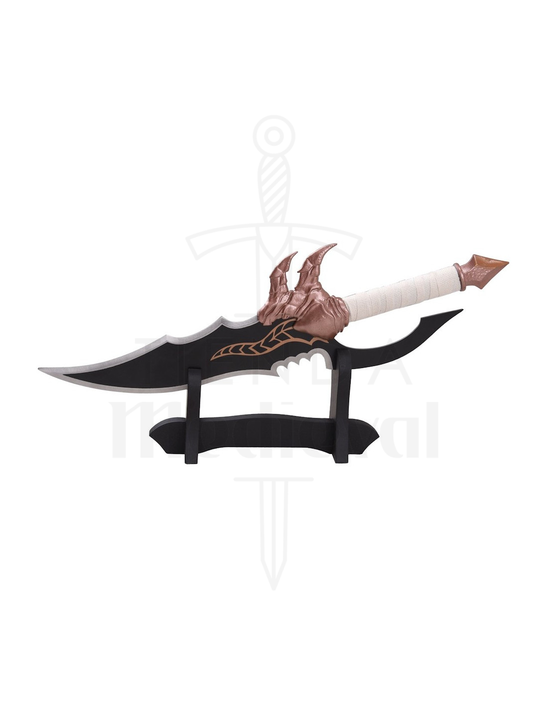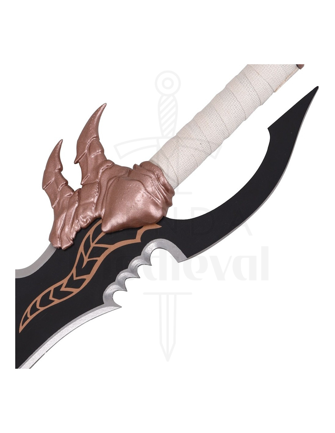 Il design irregolare della lama, con bordi ondulati e seghettati, offre un aspetto aggressivo che sembra uscito da una scena epica. La finitura nera con tocchi di rame dà profondità visiva, facendo sì che ogni angolo riveli nuovi dettagli, perfetta per chi cerca un pezzo da collezione che si faccia notare senza sforzo.