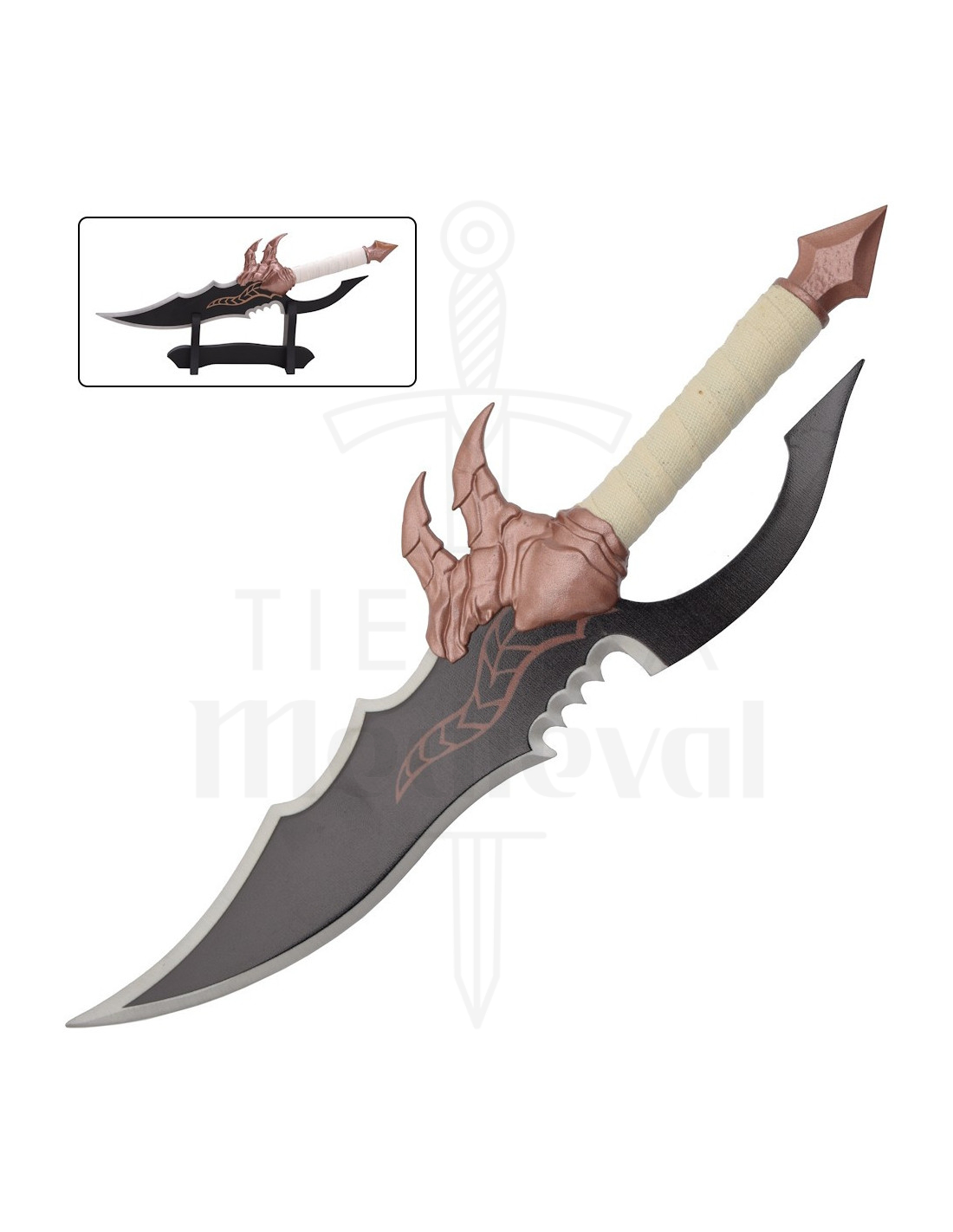 La sensazione di solidità si percepisce dalla guardia a forma di artigli fino al pomo appuntito, trasmettendo un'estetica di creatura mitica che amplifica il carattere decorativo. Il manico avvolto in corda chiara offre una presa testurizzata, facilitando la manipolazione occasionale e aggiungendo contrasto visivo con i toni metallici.