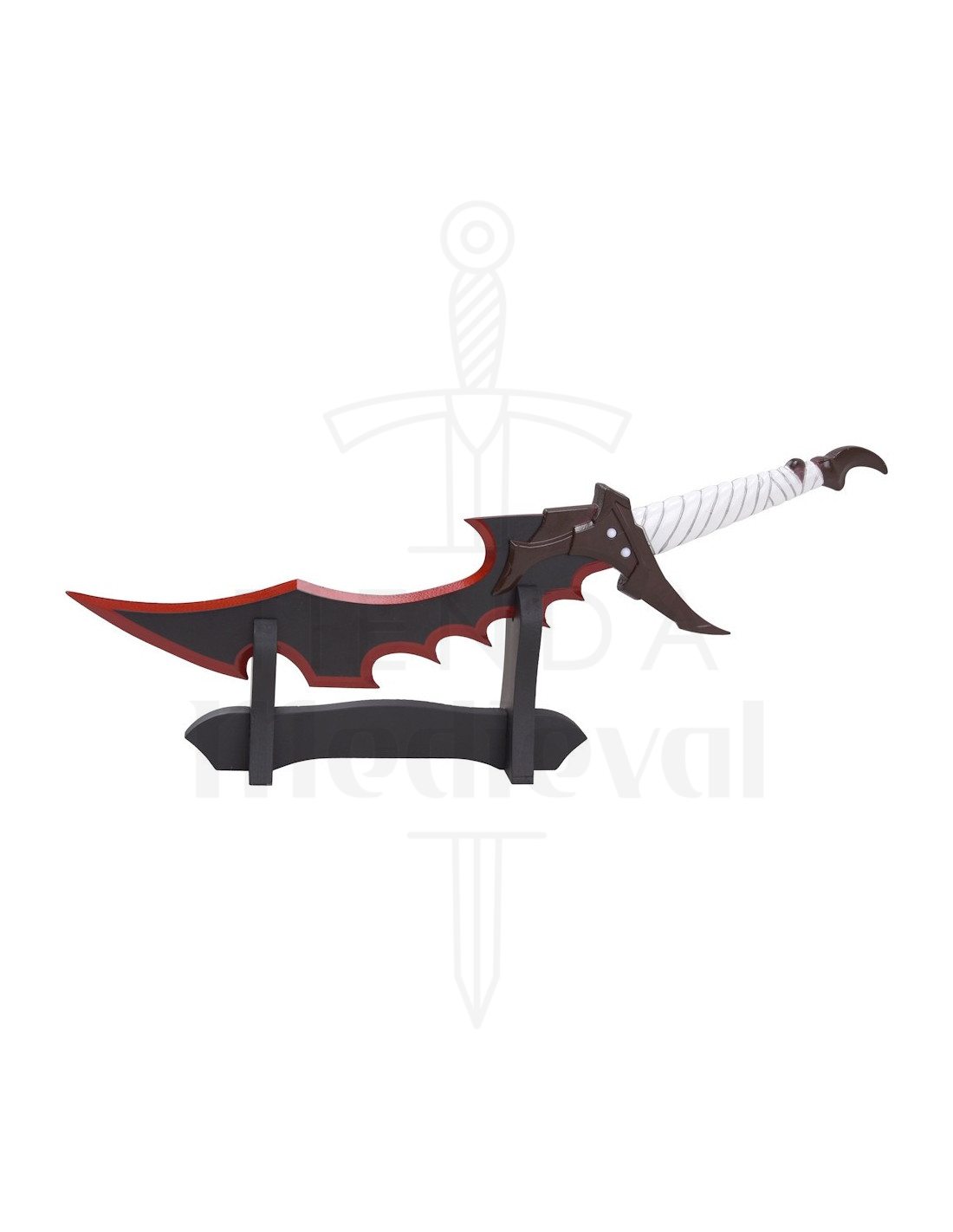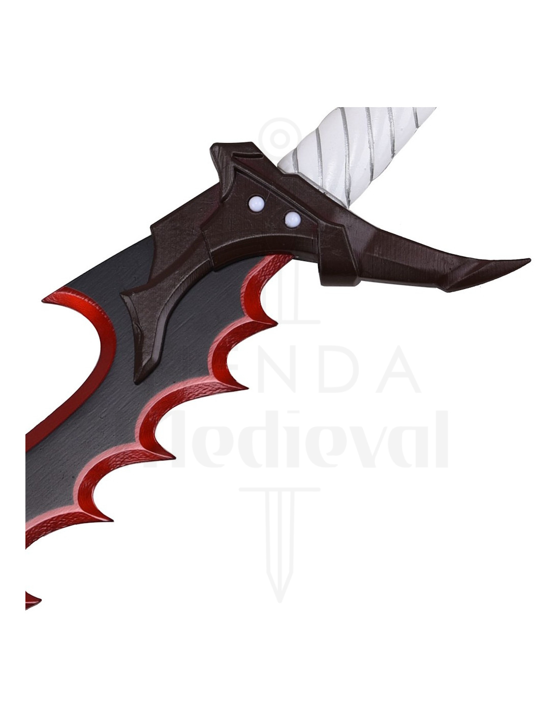 Il design angolare della protezione e del pomo in tonalità marrone scuro conferisce una silhouette aggressiva ed elegante, che rafforza la sensazione di pezzo da collezione. Il contrasto tra la lama scura con bordi rossi e l'impugnatura bianca crea un impatto visivo immediato, perfetto per chi desidera una decorazione con personalità o un complemento fotografico attraente per il suo set di collezione.