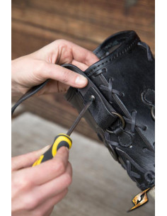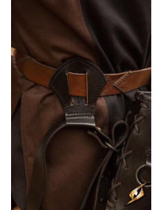 La faretra è dotata di una lunga tracolla regolabile con fibbia in ferro placcato in ottone ed è fissata ad anelli di metallo nella parte superiore e inferiore. Ci sono più posizioni dell'anello, permettendogli di essere indossato a tracolla su entrambe le spalle, o comunque è più comodo! La tracolla è fissata agli anelli con una vite a taglio dritto, rendendo molto più robusto e più facile riposizionare la faretra in qualsiasi momento con l'aiuto di un cacciavite.