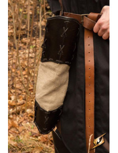 Un'altra caratteristica distintiva di questa faretra è la sua costruzione di alta qualità. È realizzata in pelle marrone e tela beige, materiali durevoli che garantiscono resistenza e durata alla faretra. Inoltre, ha un fondo circolare cucito al corpo con un cordino di cuoio appiattito, che non solo ne rinforza la struttura, ma aggiunge anche un tocco di stile ed eleganza.