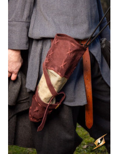 - Costruzione in pelle scamosciata beige e tela: realizzata con una combinazione di pelle scamosciata beige e tela, questa faretra offre resistenza e un autentico look medievale. Il suo design rustico si integra perfettamente con l'ambiente naturale, mentre la pelle scamosciata aggiunge un tocco di eleganza.
