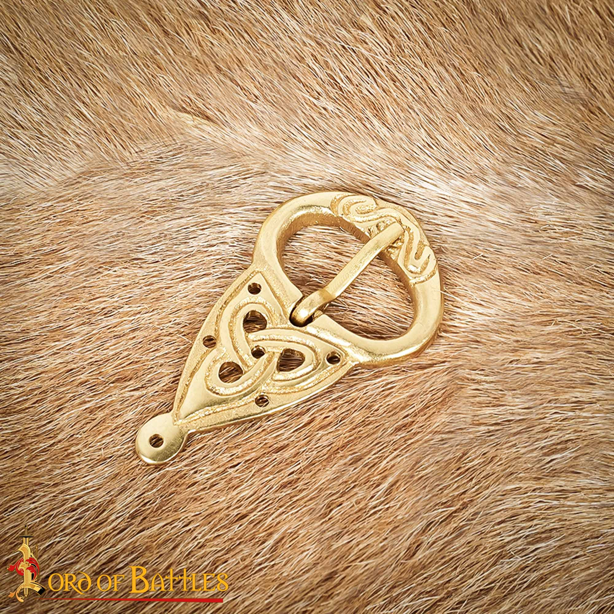 Realizzata in ottone massiccio, questa fibbia presenta una finitura dorata brillante che ne evidenzia la durata e lo stile. I intricati nodi celtici che decorano il suo corpo non solo catturano l'attenzione, ma raccontano anche storie antiche di connessione e continuità, elementi essenziali nella cultura celtica. La sua forma unica, con una delicata curva ovale e una punta elegante, aggiunge un carattere autentico a qualsiasi cintura compatibile.