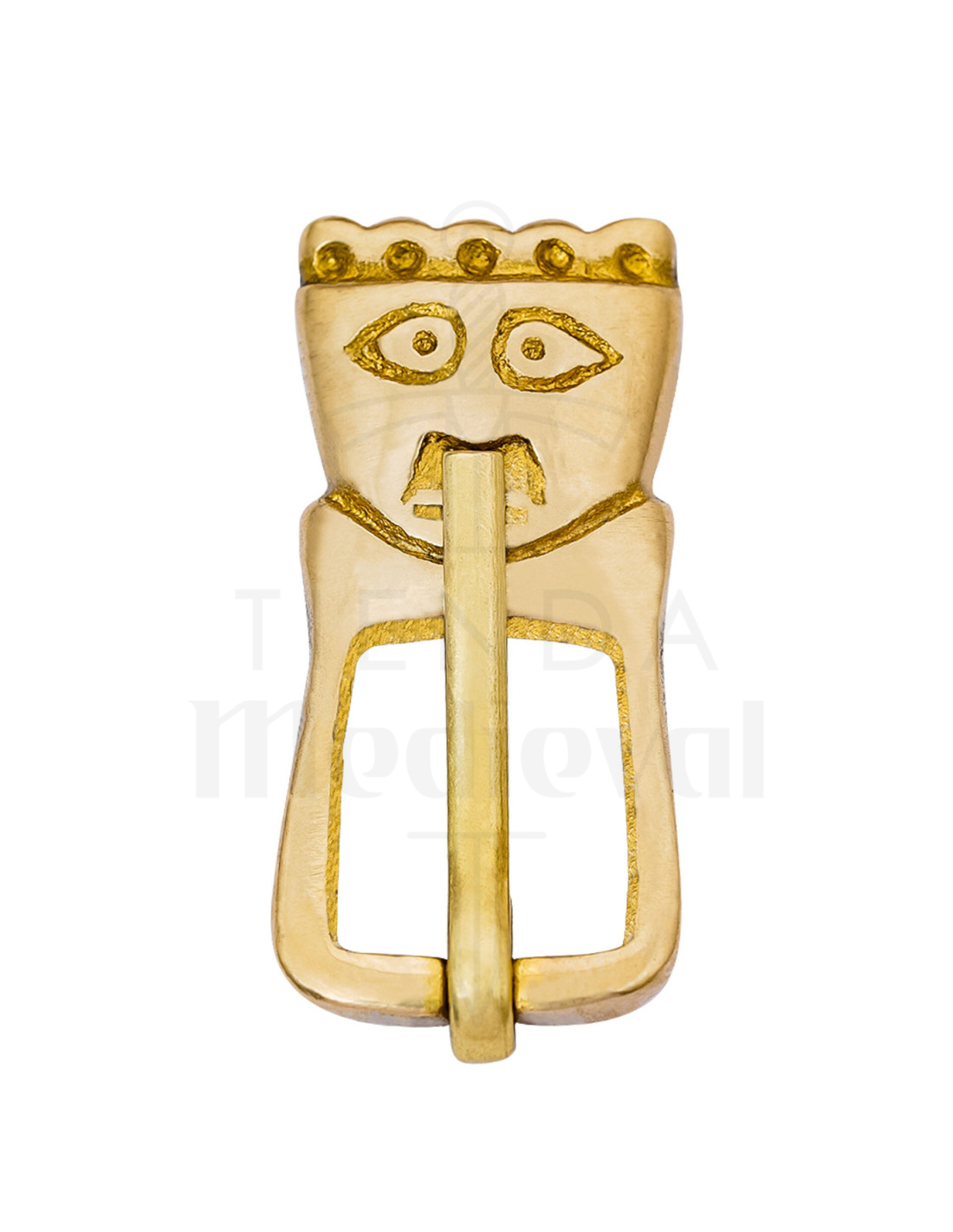 Il motivo centrale, una testa umana con occhi e bocca incisi, aggiunge un carattere figurativo e simbolico, evocando il linguaggio ornamentale del XIV secolo. I bordi leggermente irregolari e i dettagli levigati parlano di un lavoro artigianale, pensato per coloro che apprezzano l'estetica storica e l'unicità di ogni articolo.