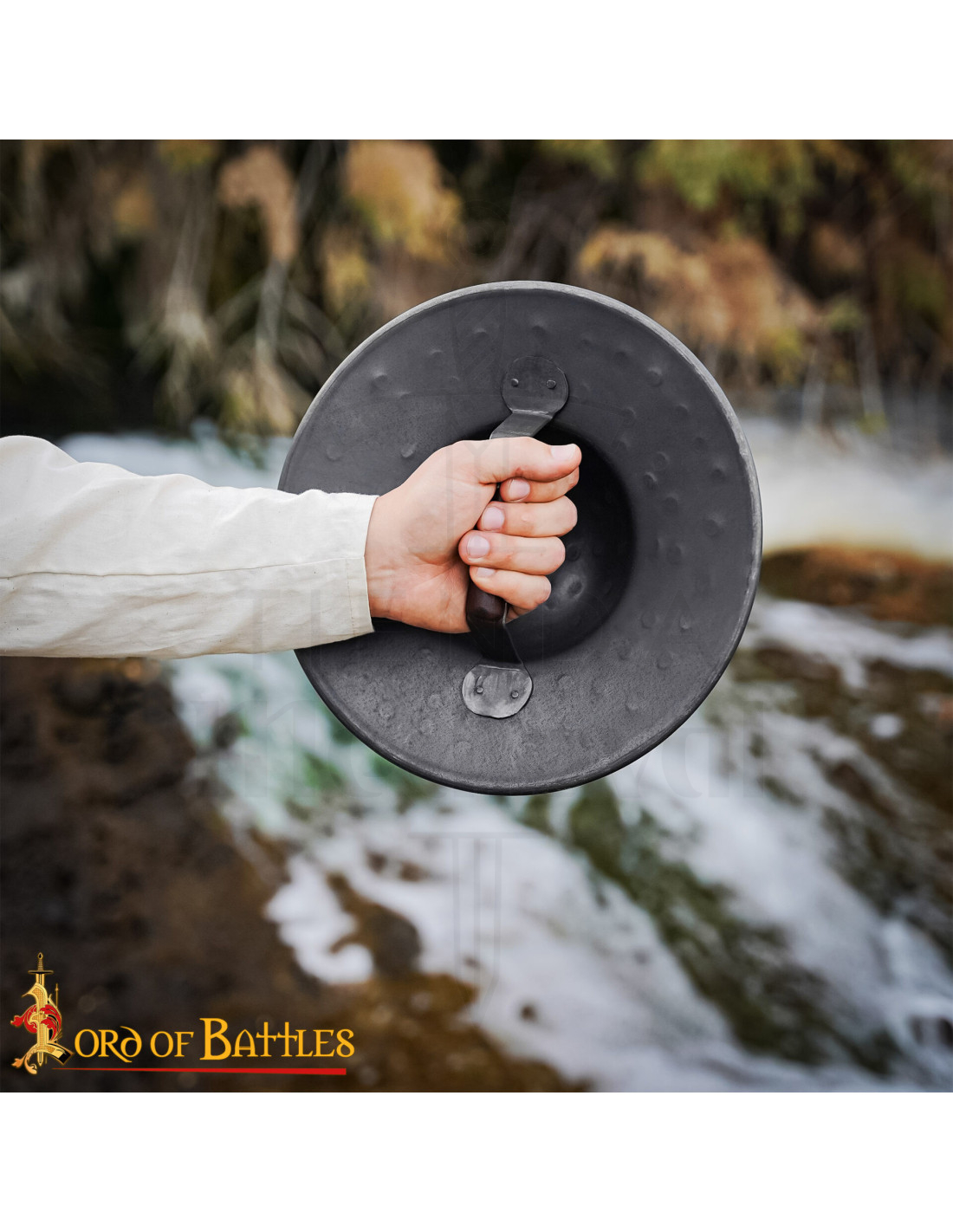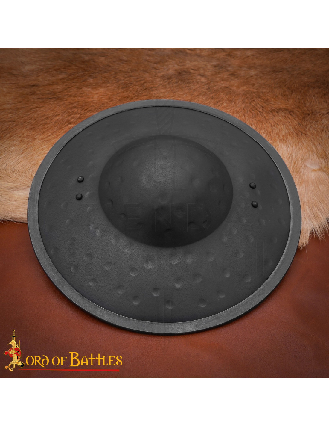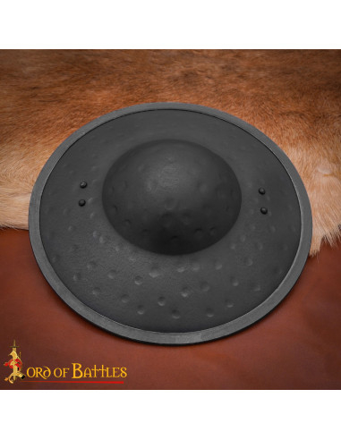 Forgiato a mano in acciaio, la sua superficie martellata crea una finitura opaca e ruvida che evita fastidiosi riflessi e aggiunge carattere a ogni blocco o parata, mentre le piccole depressioni distribuite uniformemente apportano texture e un aspetto autentico che si distingue in qualsiasi messa in scena o vetrina. Il colore nero rinforza quell'aria sobria e guerriera, perfetto per ricreazioni medievali o costumi di fantasia.