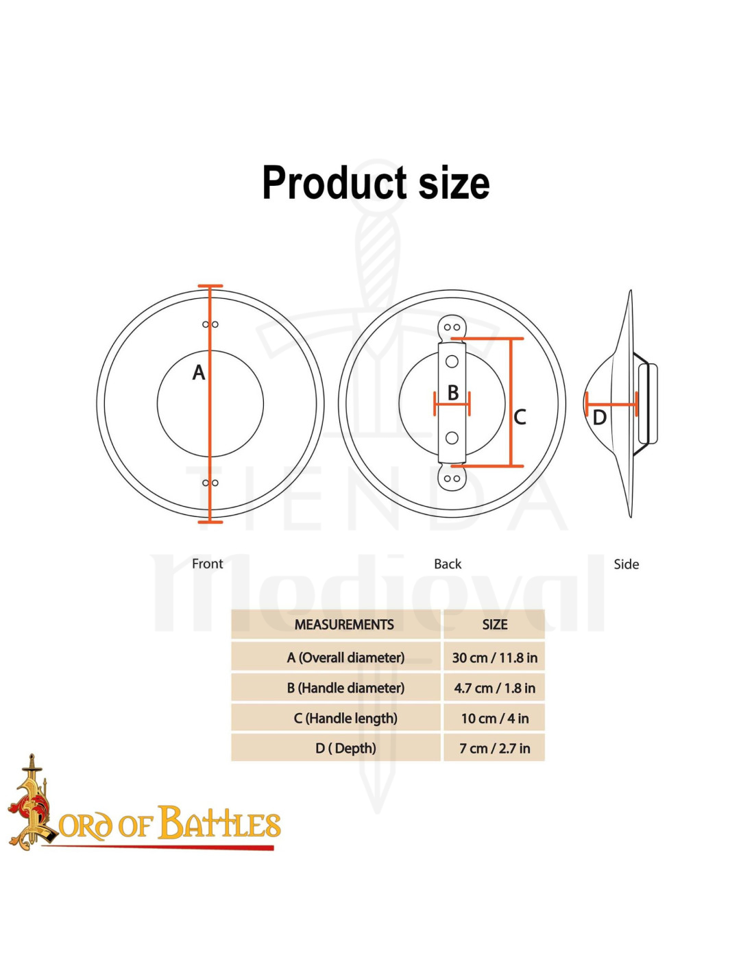 Il bordo arrotolato rafforza la struttura e offre sicurezza nella maneggevolezza, rendendo le consegne e le deviazioni più affidabili durante coreografie o pratiche. Al centro, la protuberanza elevata o umbo agisce come scudo per la mano e facilita la deviazione di colpi diretti con maggiore efficacia, migliorando la tua protezione senza sacrificare agilità.