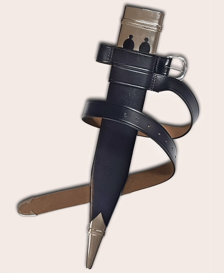 Il fodero è ornato nella parte superiore e inferiore con terminali in metallo con finitura nichel, che gli conferiscono un tocco di eleganza e raffinatezza. Inoltre, incorpora una doppia cintura in pelle per poterla indossare comodamente in vita.