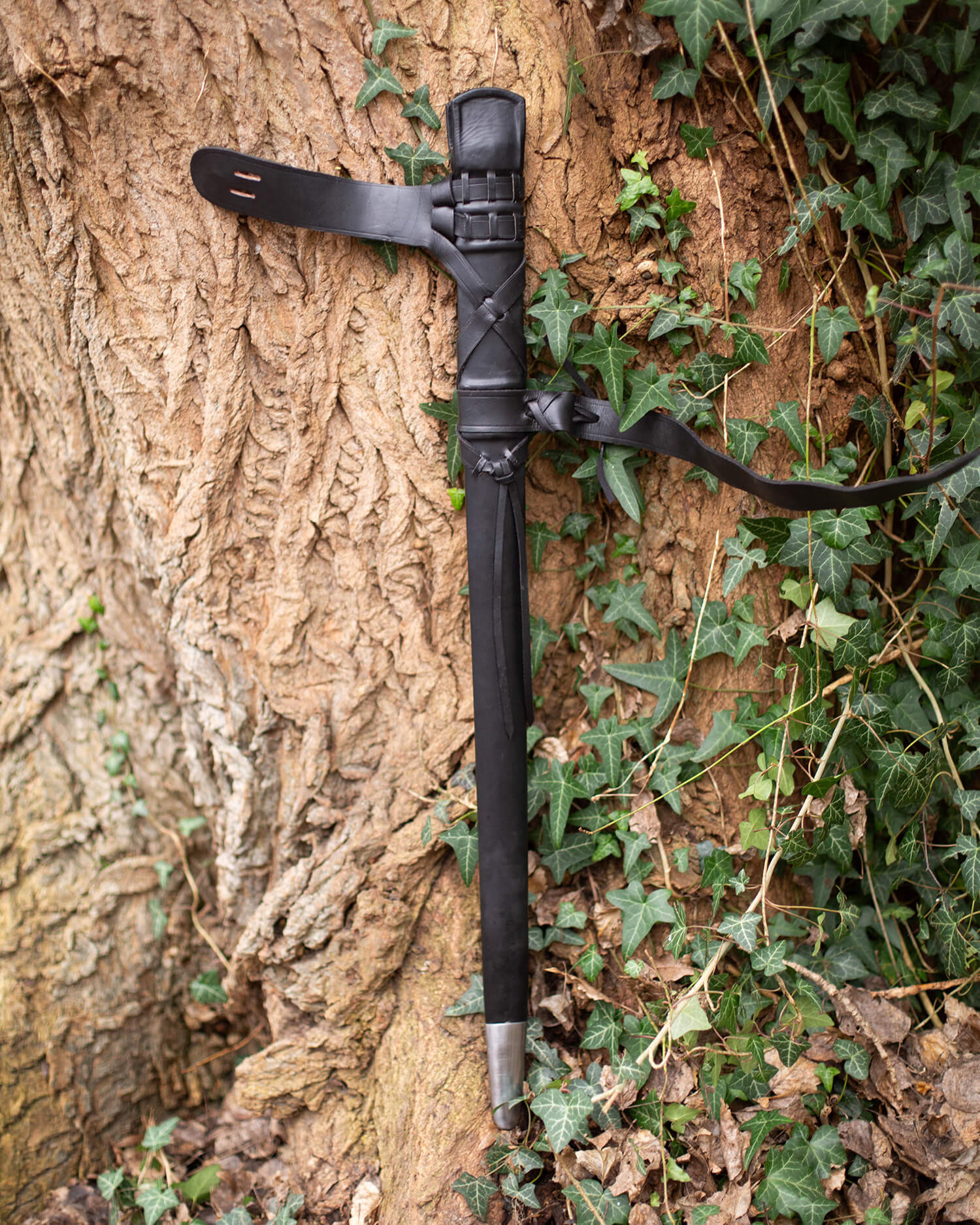 Il fodero combina un nucleo in legno rivestito in pelle, il che si traduce in una silhouette che mantiene la sua forma, protegge la lama e dà una sensazione di robustezza ogni volta che lo afferri. Nell'immagine è evidenziata una pelle scura che esalta i nastri e conferisce al pezzo un aspetto sobrio e curato, perfetto per chi cerca un'estetica curata senza rinunciare alla funzionalità.