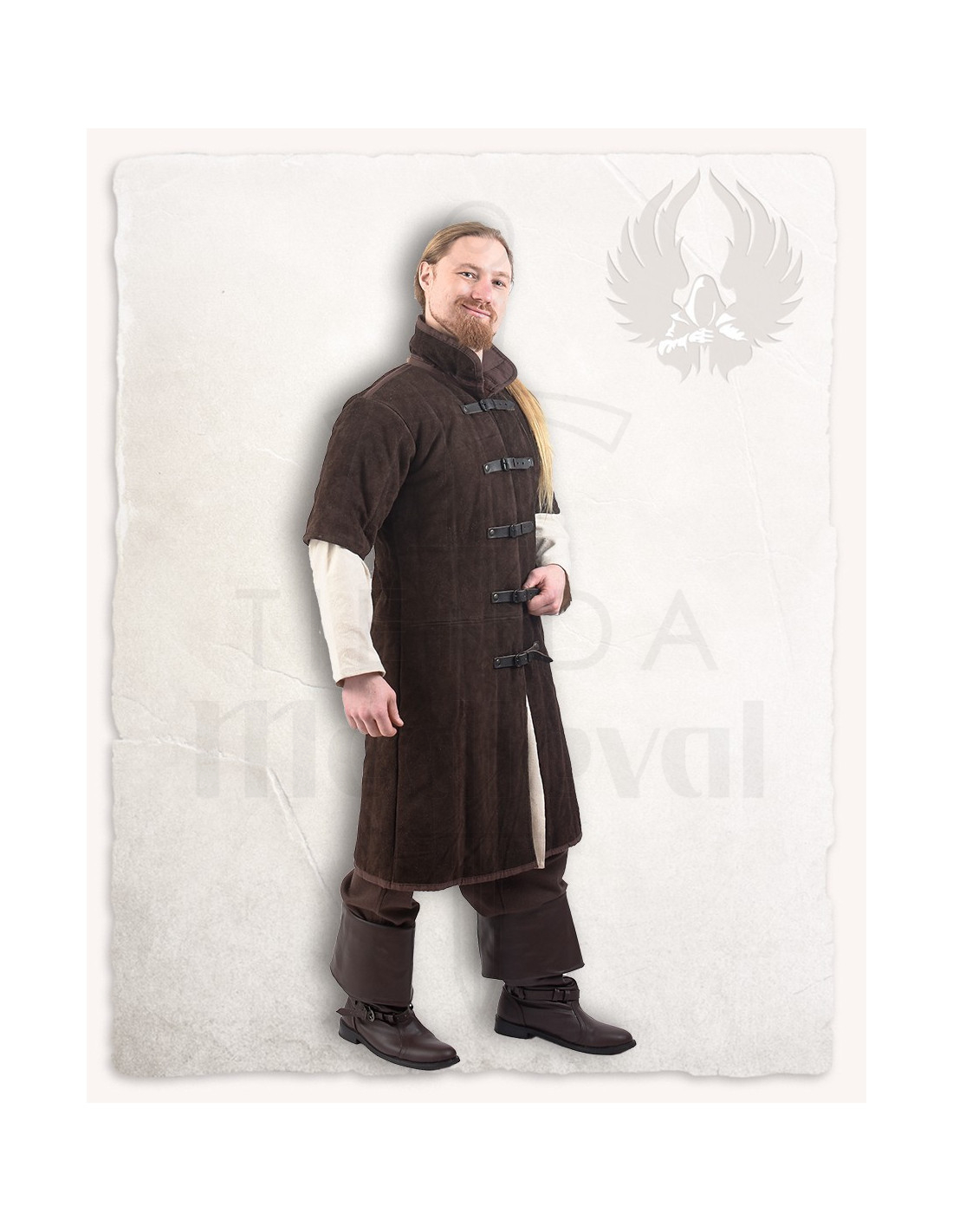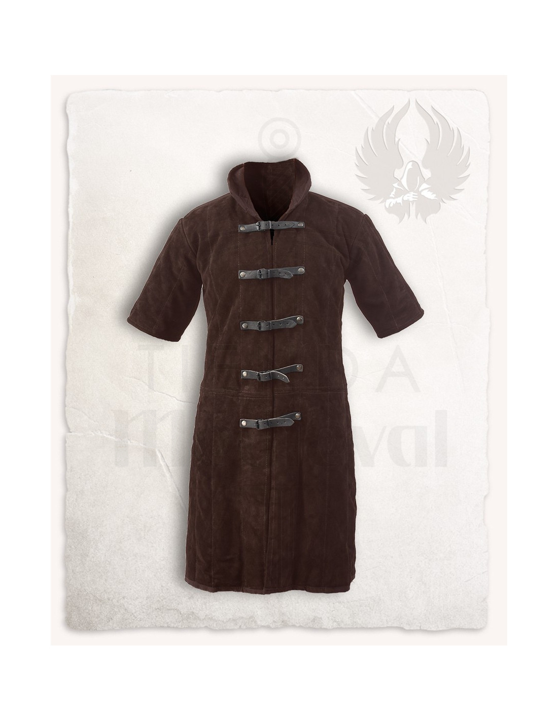 Con maniche corte e un'apertura sulla schiena, permette una libertà di movimento eccezionale, fondamentale nel combattimento o in attività che richiedono mobilità. La chiusura frontale con cinque cinturini e fibbie a rotella non solo assicura una vestibilità salda, ma conferisce anche un carattere distintivo e robusto. La texture morbida e la finitura in camoscio marrone scuro, simile alla pelle scamosciata, trasmettono un aspetto autentico e confortevole al tatto, perfetto per eventi storici o ricostruzioni medievali.