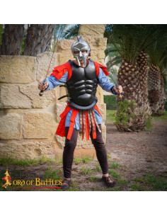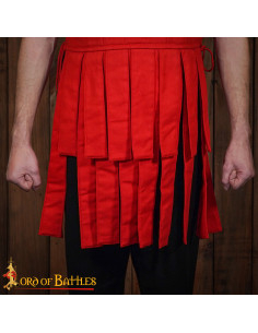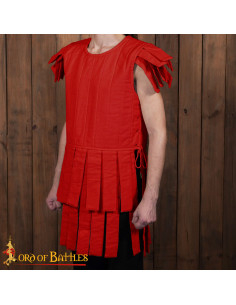 Grazie al suo sistema di chiusura laterale, regola facilmente e comodamente il gilet alla tua misura, sia sopra una tunica che sotto un'altra armatura. La struttura esterna in tela di cotone resistente, cucita con precisione artigianale, garantisce durabilità per lunghe giornate di utilizzo. Ogni pezzo, accuratamente realizzato a mano, riflette un'autenticità che distingue i veri appassionati del mondo romano. Inoltre, il vivace colore rosso e i dettagli nel design, come i plissettature decorative nella parte inferiore, aggiungono un tocco di autorità e stile classico.