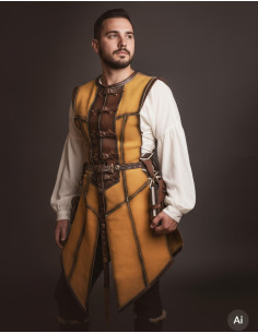 Visivamente, la tonalità gialla del camoscio aggiunge carattere e distinzione, evidenziando dettagli e accessori senza opacizzarli. Le aree rinforzate non solo migliorano il design, ma proteggono e prolungano la vita del capo, rendendola ideale sia per giorni di combattimento ricreato che per banchetti e rappresentazioni.