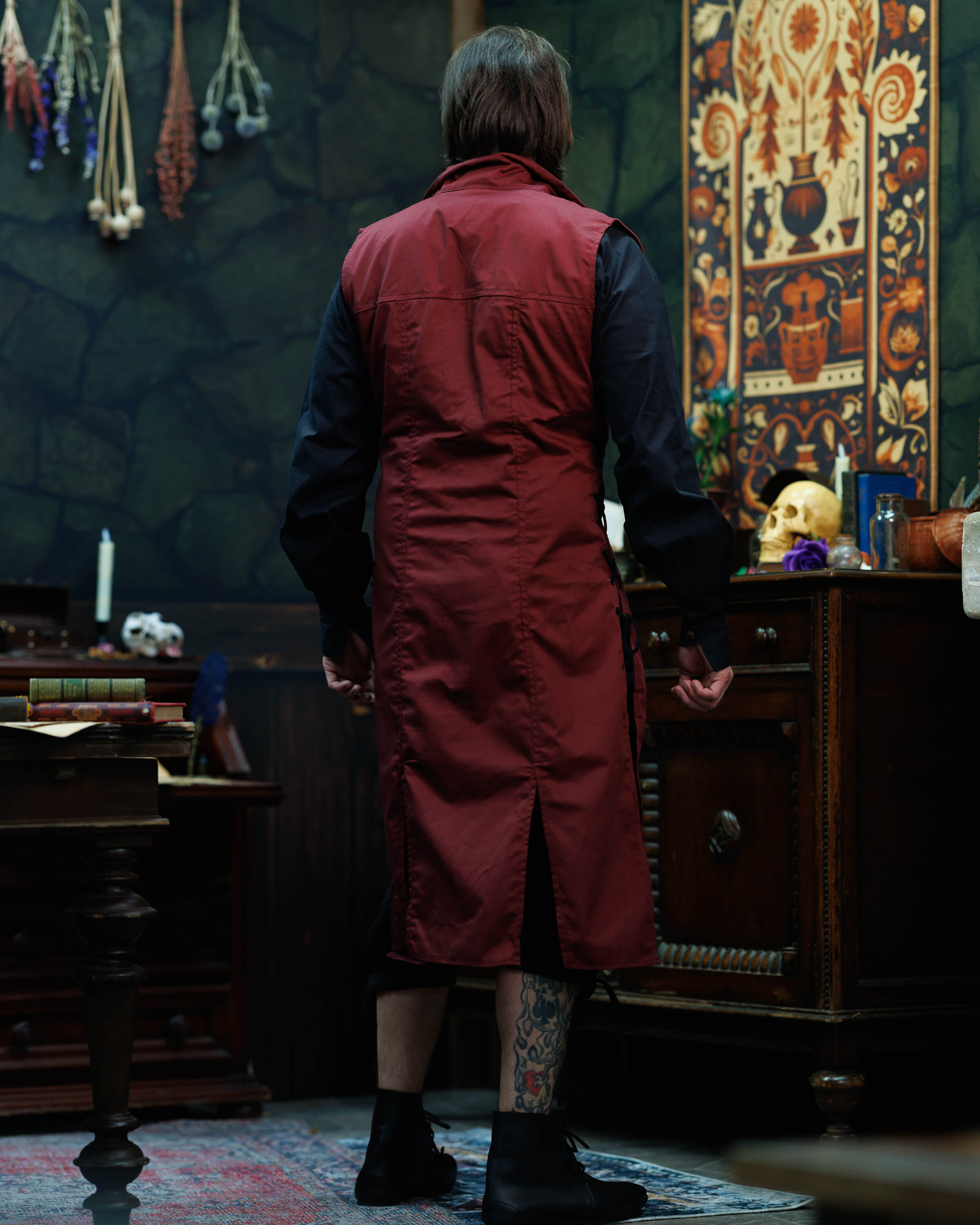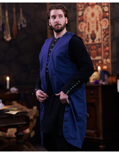 Con un colletto a revers che ricorda un sarto classico, il capo acquista un'aria raffinata che si adatta sia a interpretazioni nobili che a personaggi più oscuri, come alchimisti o maghi. Appartenente alla serie gotica, questo design evoca atmosfere narrative, portando autenticità e presenza a qualsiasi outfit ispirato a universi di fantasia.