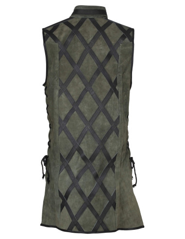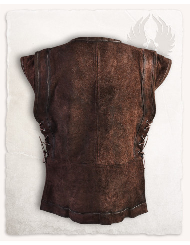 Il pezzo offre uno strato funzionale che si percepisce indossando: il suo taglio senza maniche rispetta la libertà di movimento, consentendo di indossare tuniche, mantelli o giubbe sopra senza che nulla limiti i tuoi gesti. La lunghezza che scende vicino al ginocchio crea una silhouette elegante e protettiva, ideale per scene che richiedono una presenza prolungata in spazi freddi o con correnti.