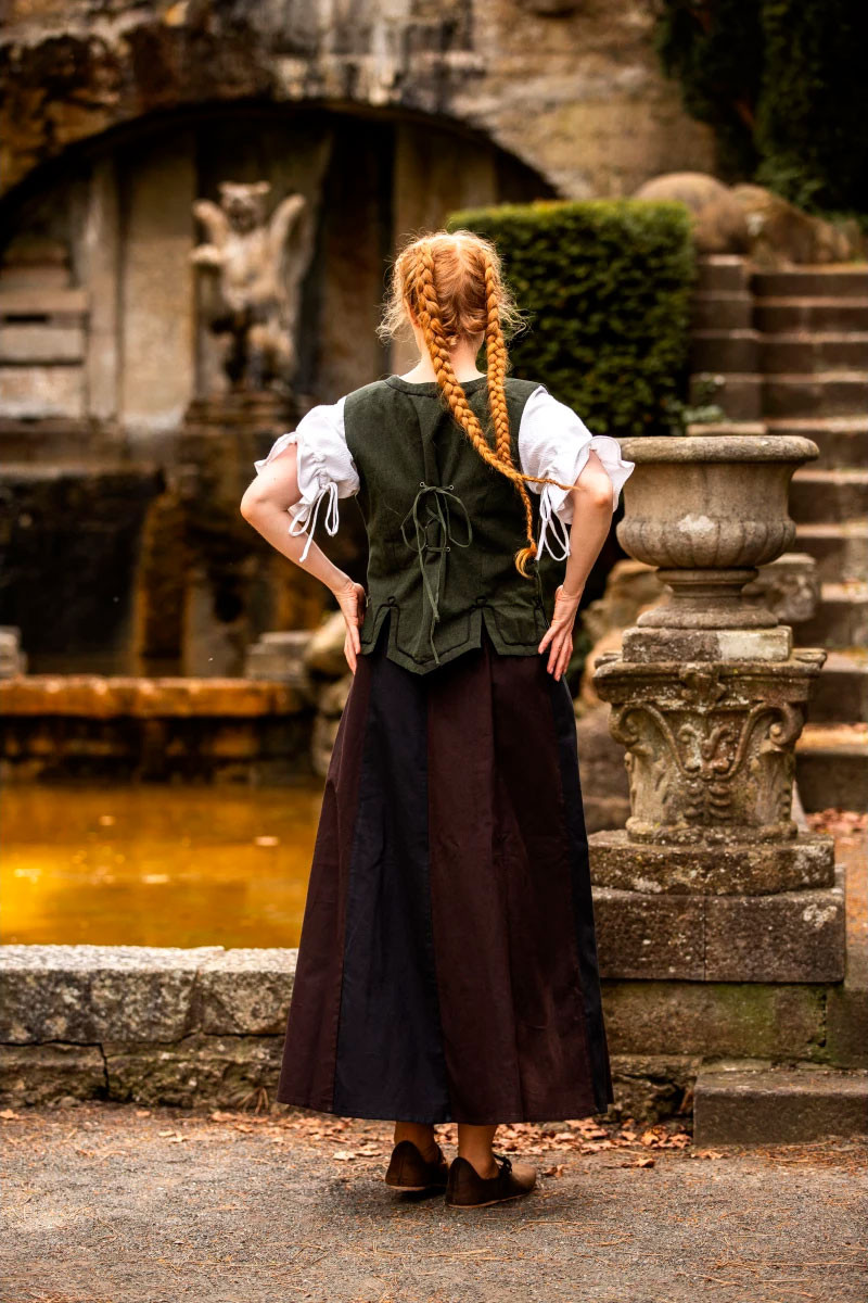 Il Gilet Medievale da donna modello Selma è prodotto in Germania dal rinomato marchio Leonardo Carbone, sinonimo di eccellenza e autenticità nei capi medievali.
