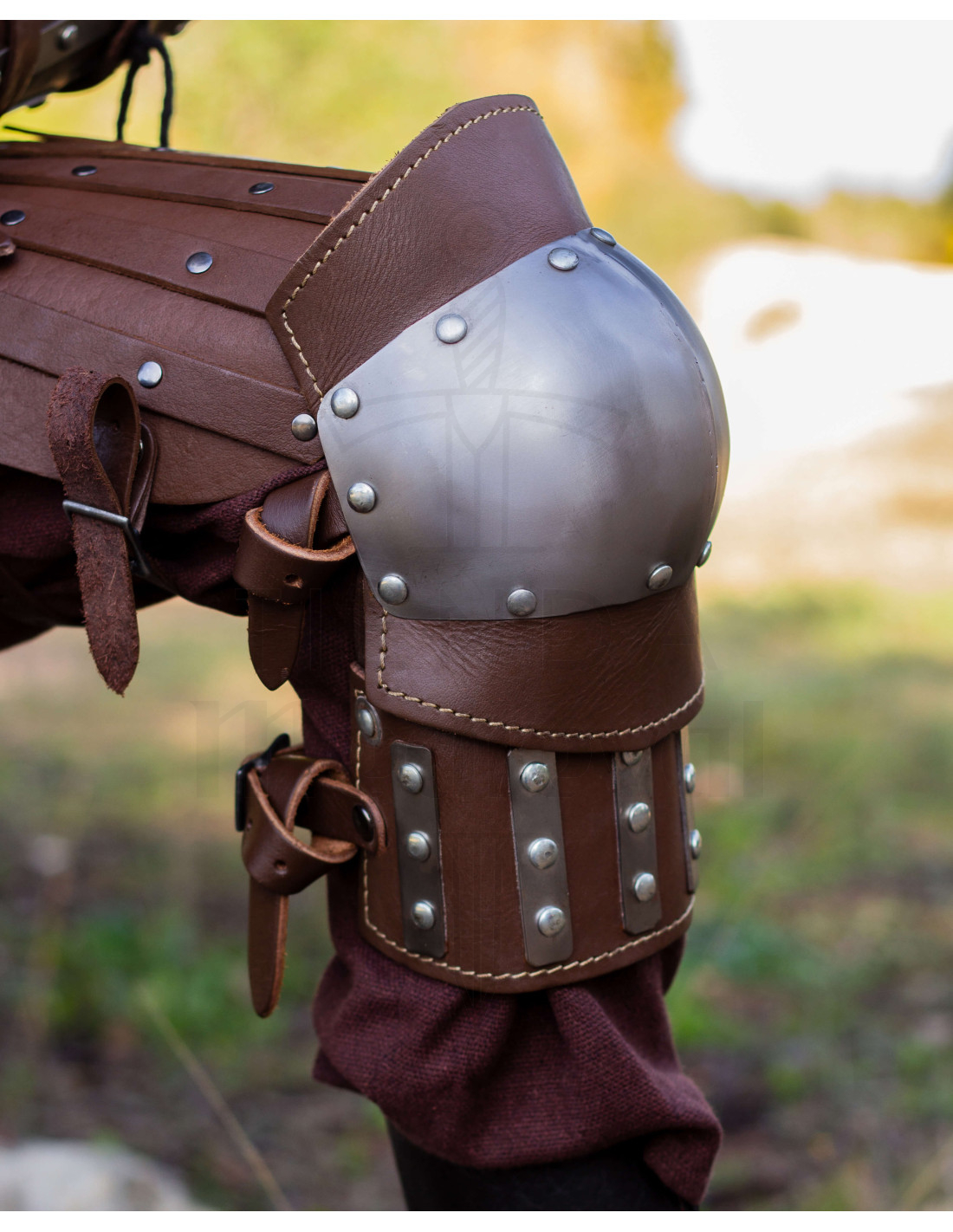 Realizzato in cuoio marrone dall'aspetto profondo e finiture in acciaio argentato, il pezzo trasforma materiali tradizionali in una difesa affidabile. La copertura metallica rivettata e le strisce verticali rinforzano la parte superiore, proteggendo l'articolazione mentre mantengono un profilo elegante che non ruba protagonismo al complesso.