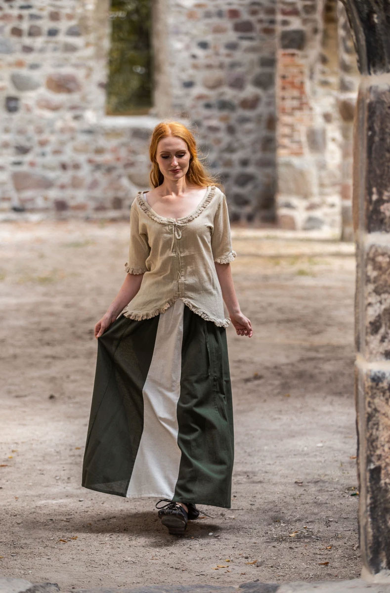 Scopri la gonna medievale da donna modello Diana, un capo che ti porterà al tempo dei cavalieri e dei castelli. Realizzata con una combinazione di cotone e lino, questa gonna ti offre un comfort senza pari. Inoltre, il suo taglio semplice in un colore bianco-verde naturale è perfetto per ogni occasione.